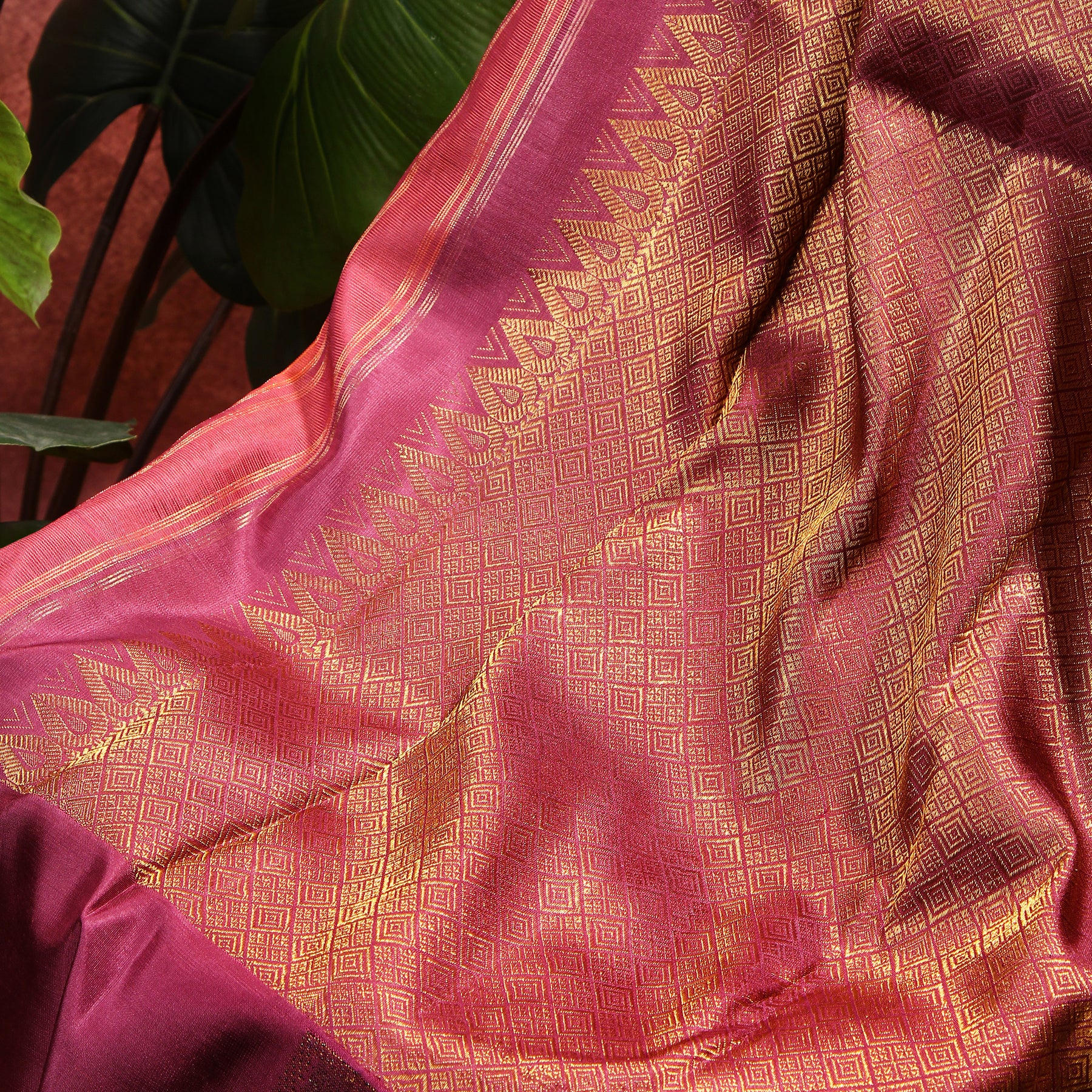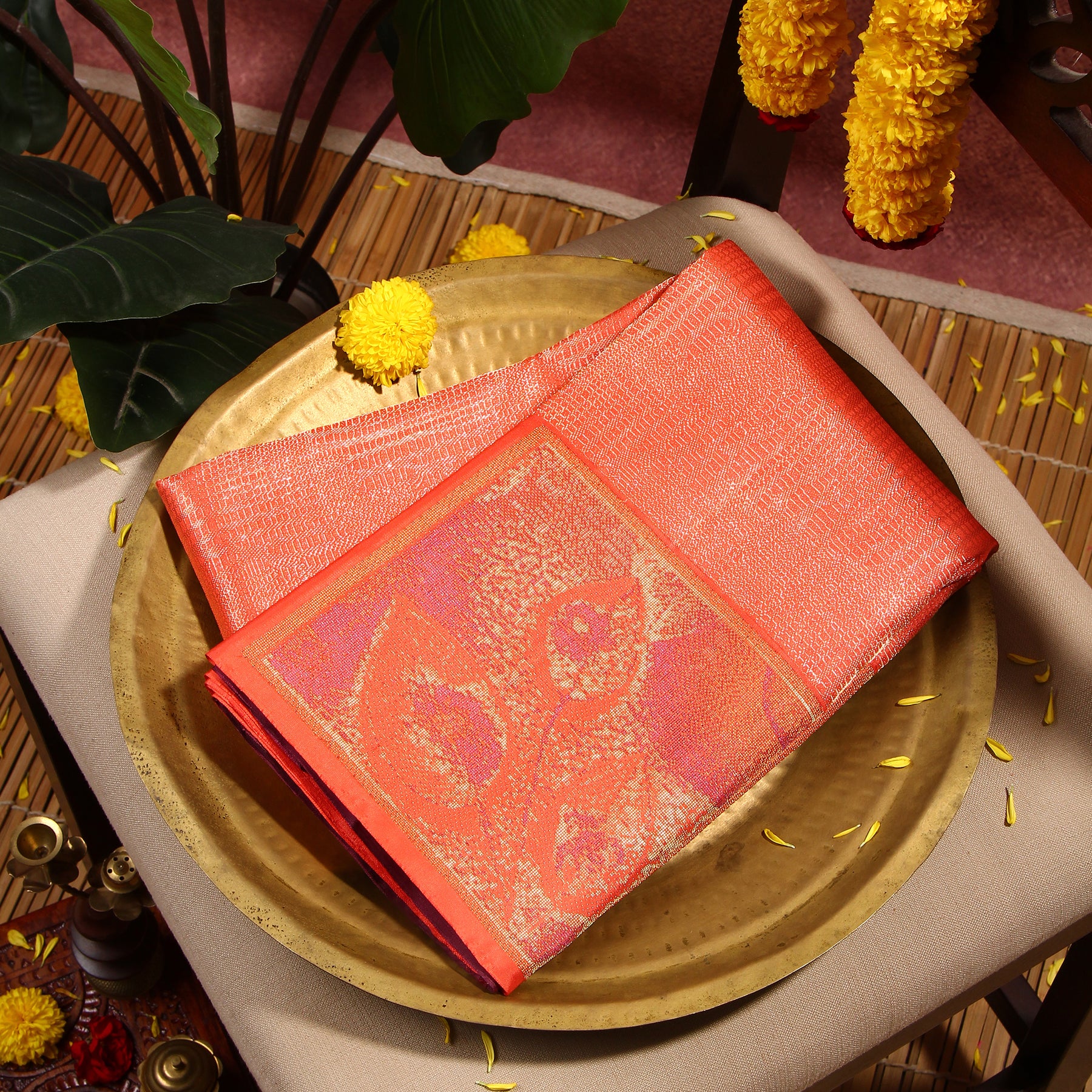 Indulge in luxury with our Kuberan orange peach Kanchivaram Saree. The abstract Zari work adds a touch of exclusivity while the unique border elevates its elegance. Perfect for any special occasion, this saree will make you stand out with its sophisticated beauty.