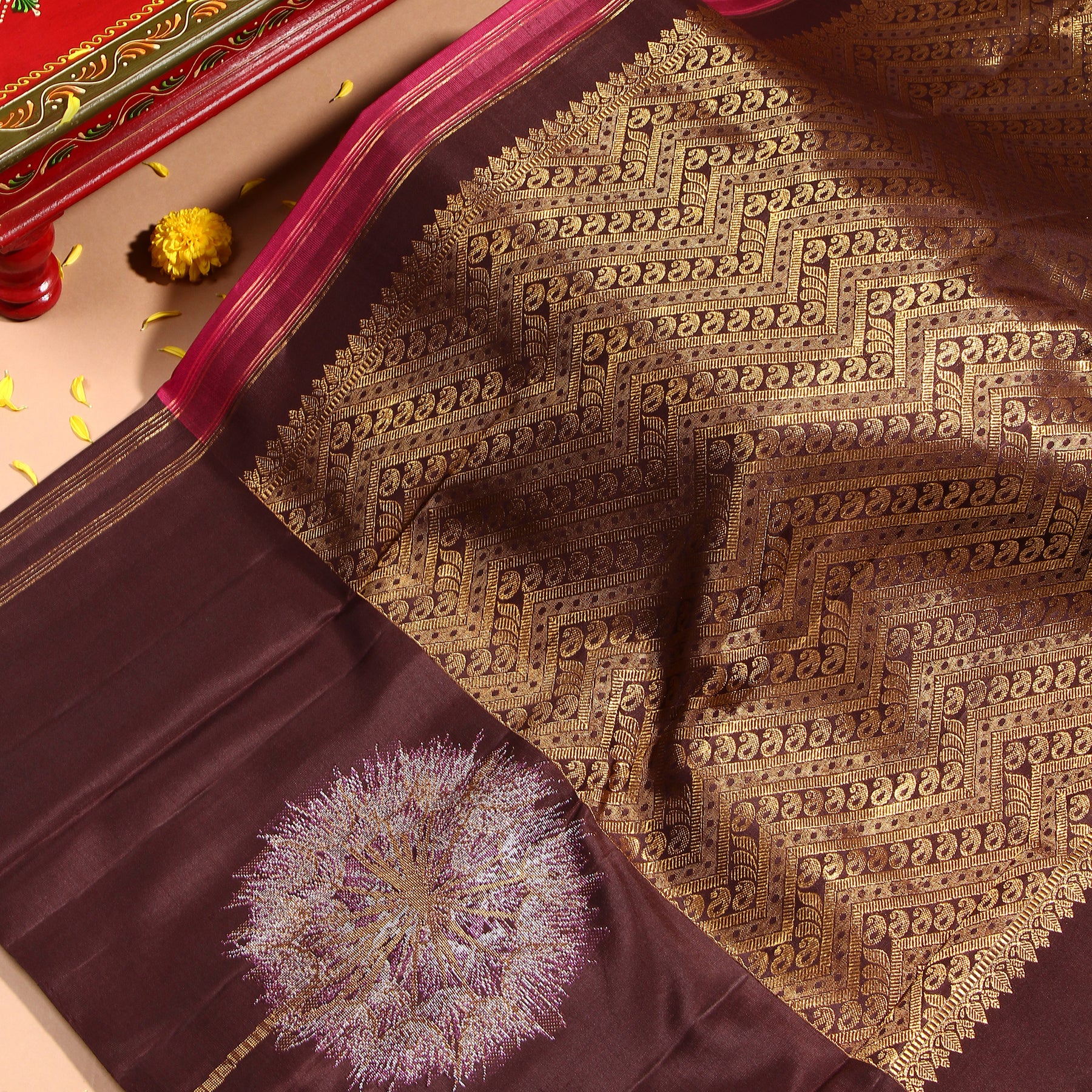 Experience elegance and sophistication with our Kuberan Red Wine Kanchivaram Saree. The unique dandelion border and beautiful silver zari all over the body make this saree a must-have for any special occasion. Indulge in luxury and make a stunning statement with this saree.