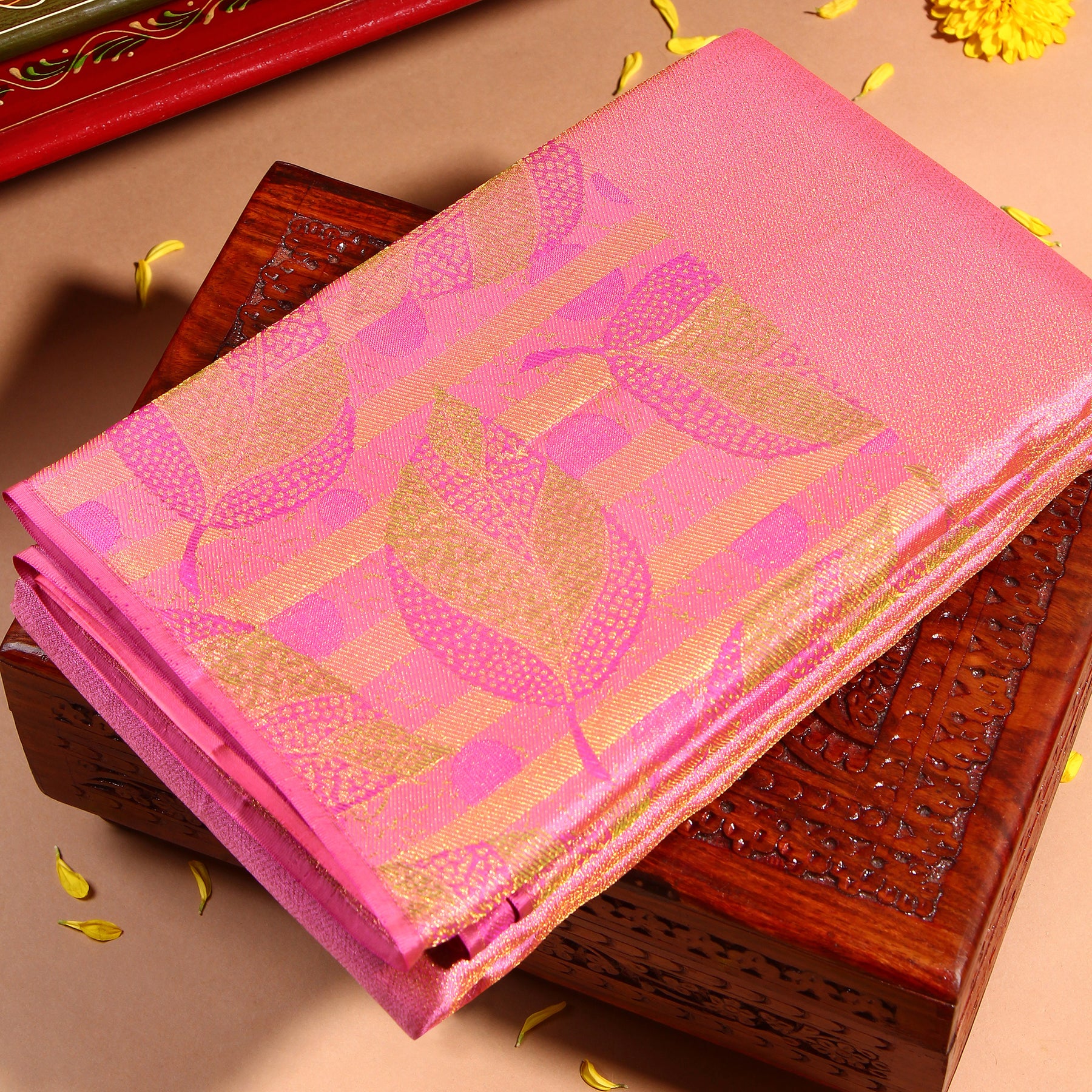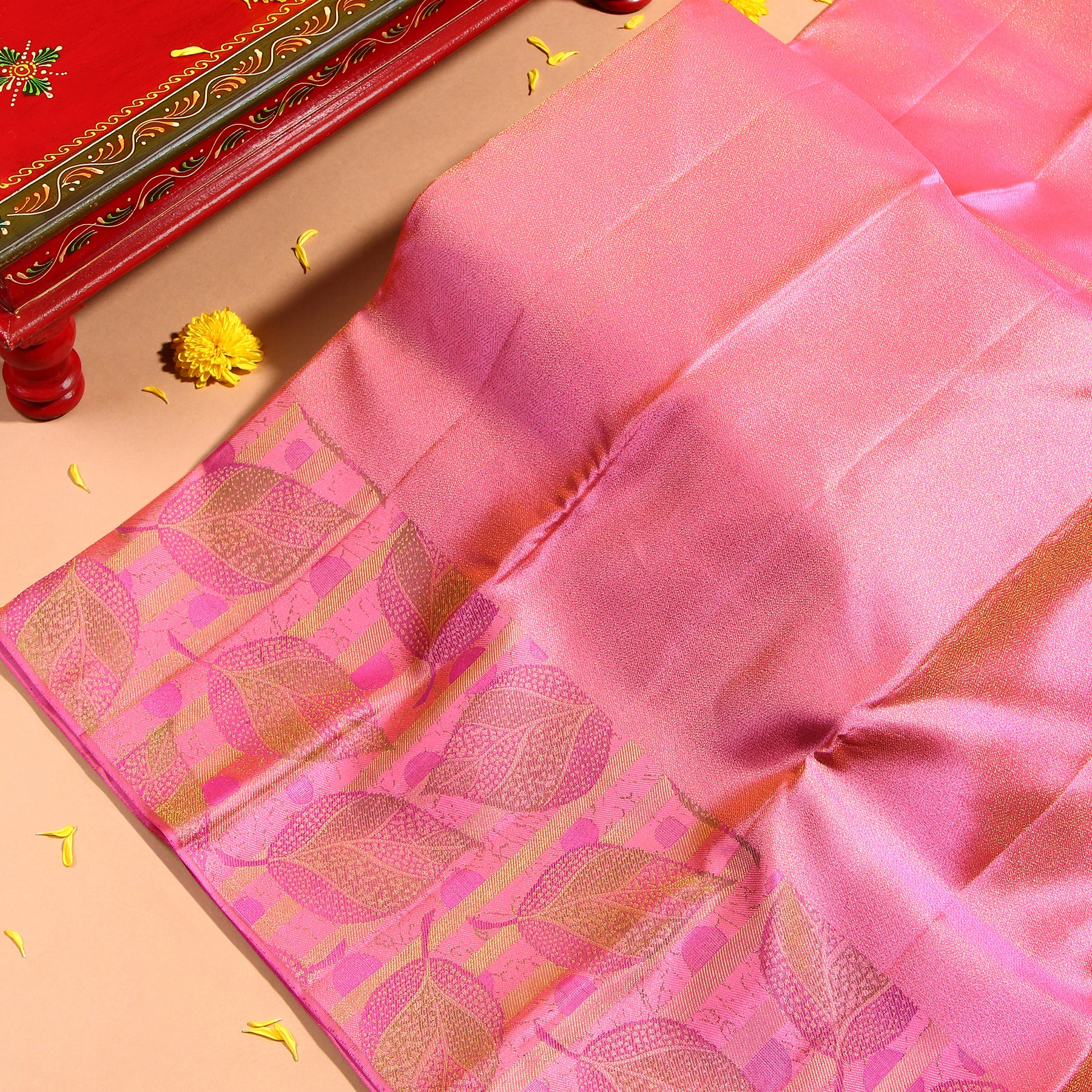 This Kuberan Rosy Pink Kanchivaram Saree boasts a unique border and stunning all-over gold Zari work. Elevate your style with this elegant saree, perfect for any occasion. Handcrafted with care, it showcases the artisanal beauty of traditional Indian fashion.