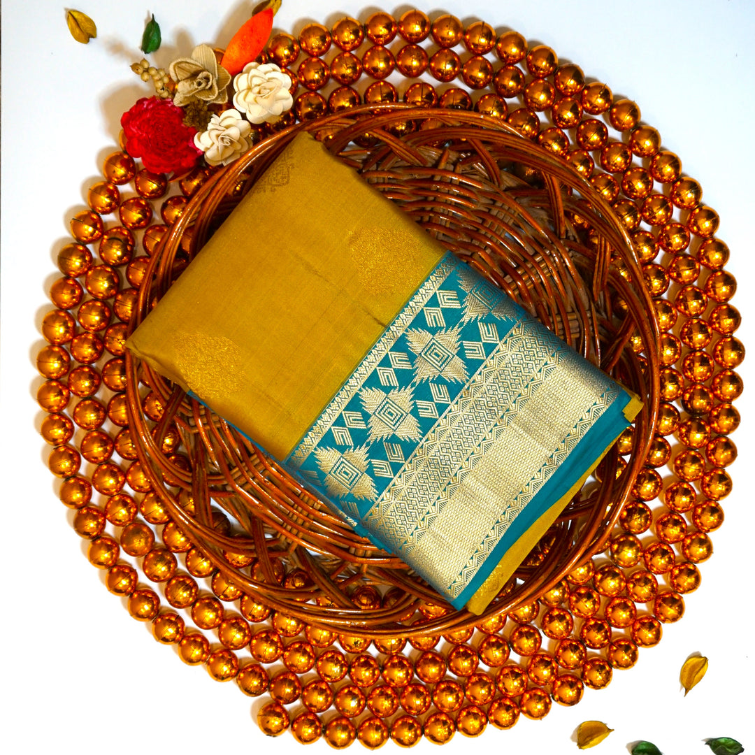 Kuberan Mustard Yellow With Dark Turquoise Blue Kanchivaram Saree