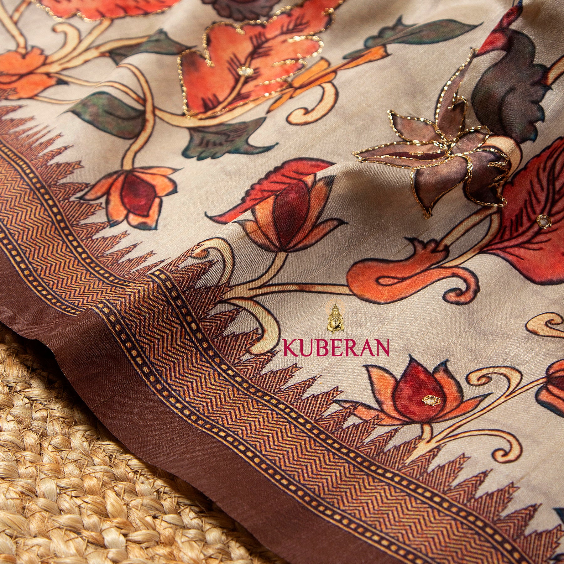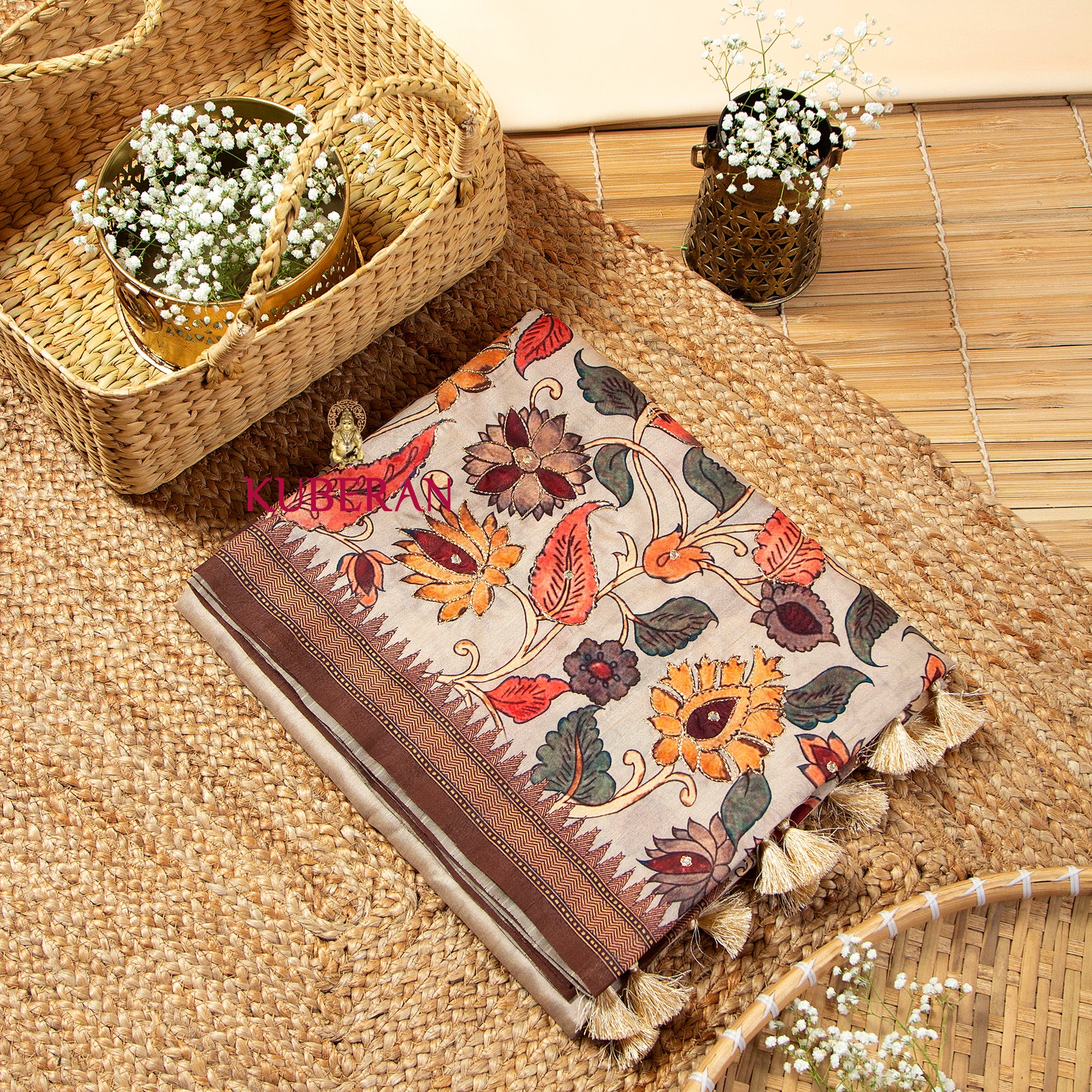 Experience elegance and luxury with our KUBERAN PEARL BUSH KALAMKARI SAREE. Handcrafted with intricate Kalamkari work and adorned with delicate pearls, this saree is a true masterpiece. Turn heads and feel like a queen wherever you go. Elevate your style and stand out from the crowd with this stunning saree.