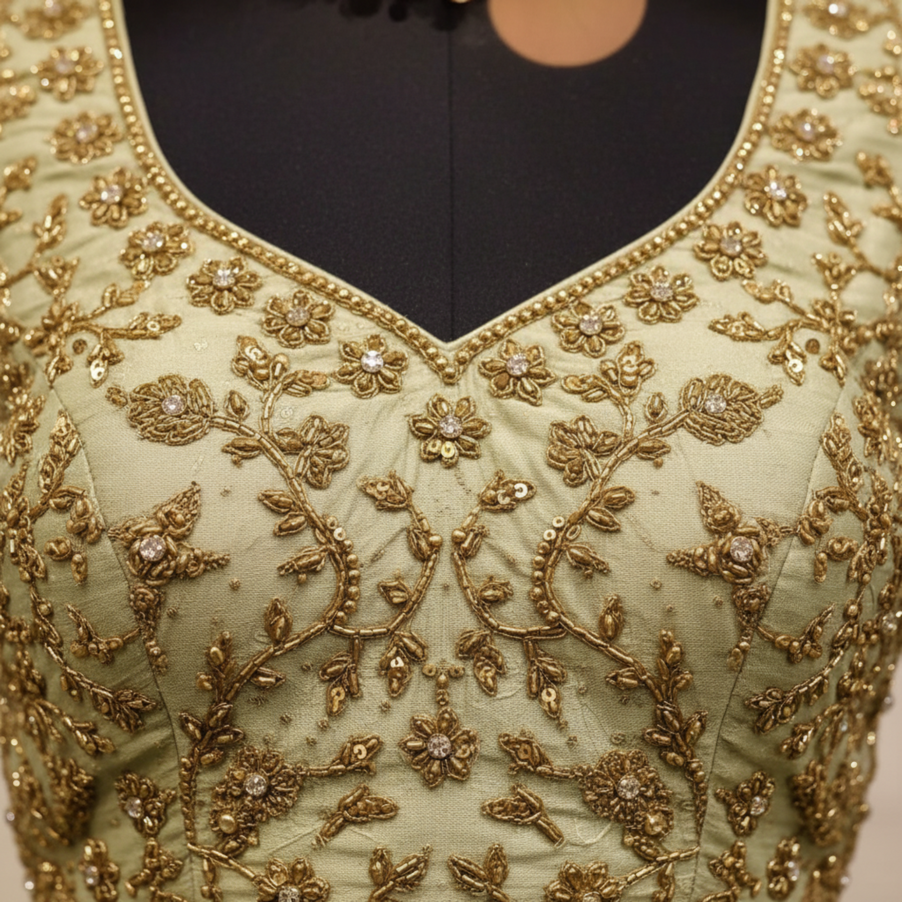- Intricate golden zari work, stone embellishments, and thread embroidery