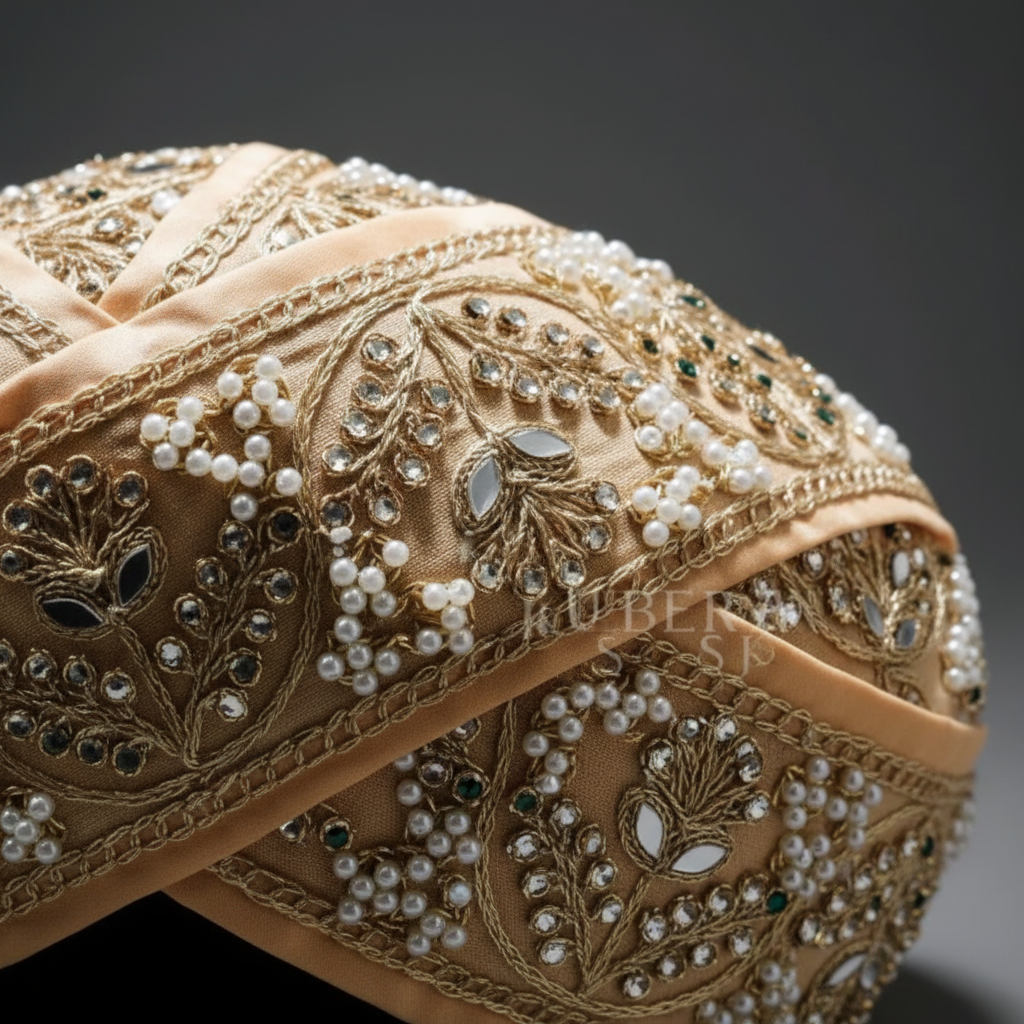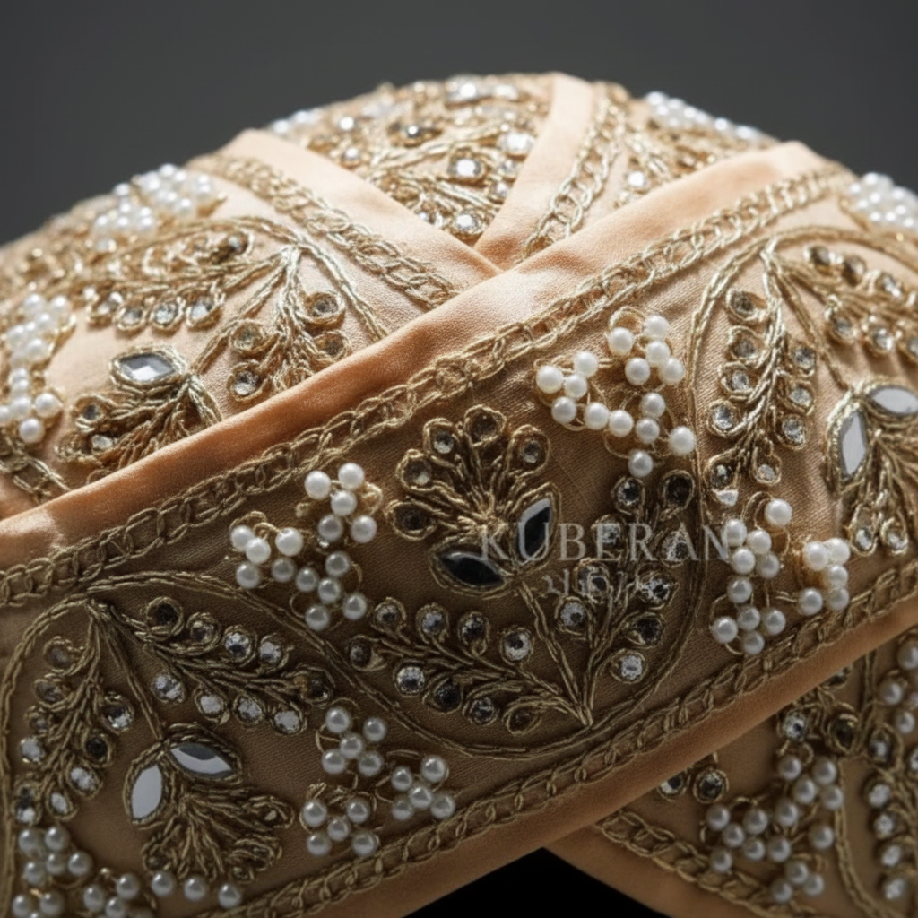 Embrace tradition with the Kuberan Designer Mysore Peta, an essential accessory for Muhurtham ceremonies and formal South Indian celebrations. This distinguished headwear features a rich deep GOLD hue that radiates elegance and cultural significance. Crafted with meticulous attention to comfort, it sits gracefully throughout your auspicious occasion without compromising on fit or style. Ideal for grooms and family members, this authentic peta honors centuries of weaving heritage while adding timeless sophistication and cultural pride to your special moments. A cherished choice for those who value tradition and refined craftsmanship.