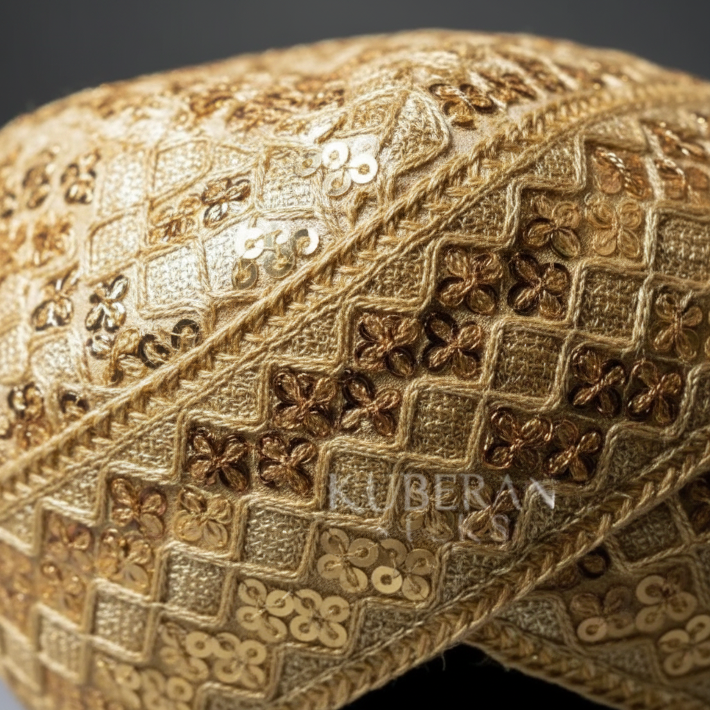 Embrace tradition with the Kuberan Designer Mysore Peta, an essential accessory for Muhurtham ceremonies and formal South Indian celebrations. This distinguished headwear features a rich deep gold hue that radiates elegance and cultural significance. Crafted with meticulous attention to comfort, it sits gracefully throughout your auspicious occasion without compromising on fit or style. Ideal for grooms and family members, this authentic peta honors centuries of weaving heritage while adding timeless sophistication and cultural pride to your special moments. A cherished choice for those who value tradition and refined craftsmanship.