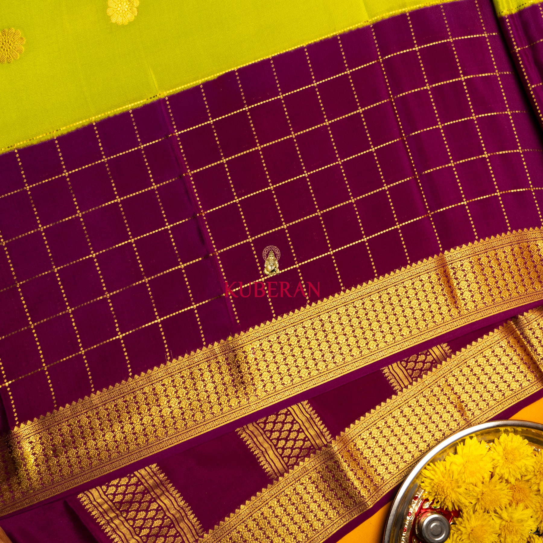 This kuberan green saree is made of pure mysore silk, featuring a beautiful combination of purple and gold borders. The rich colors of this saree will complement any complexion. Experience the luxurious feel of mysore silk while making a statement with this elegant, traditional piece.