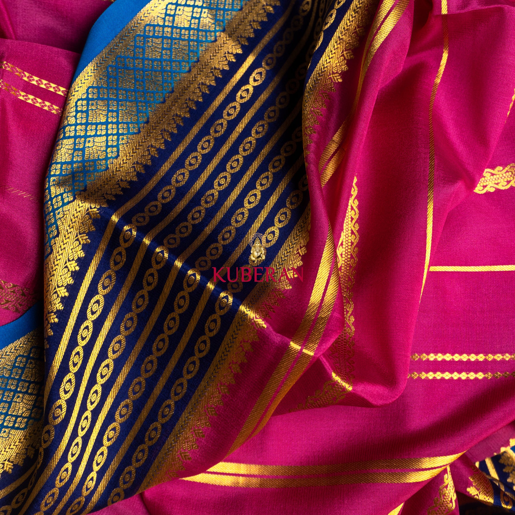 Crafted from high-quality mysore silk, this saree features a stunning kuberan pink hue with a royal blue border. Elevate your traditional wear with this luxurious and elegant piece, perfect for special occasions. Add a touch of royal charm to your wardrobe with this saree.