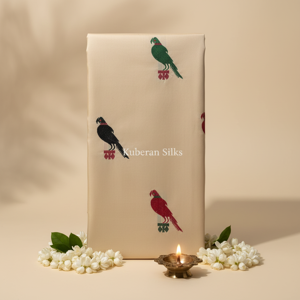 Kuberan Beige Kanchipuram Silk Saree with Parrot Motifs