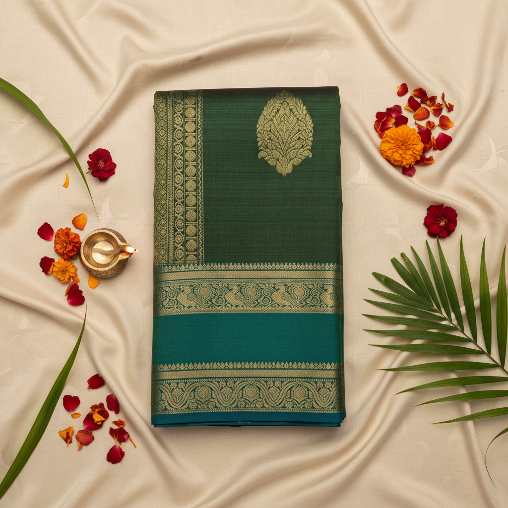 kuberan Bottle Green Kanchipuram Silk Saree with Golden Peacock Border