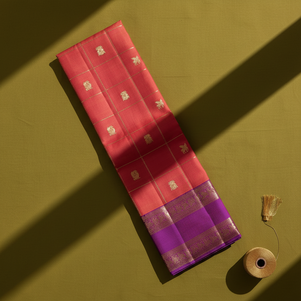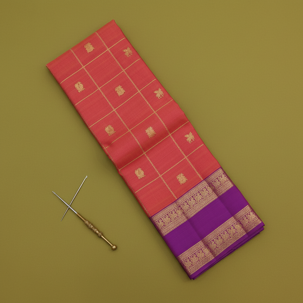 - Body: Coral salmon pure silk with fine gold zari check grid (kattam) and alternating floral bouquet and bird buttas