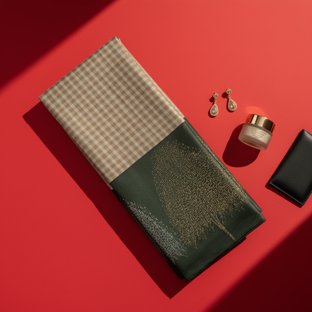 A saree that bridges the traditional and the contemporary — the body woven in ivory cream with a fine gingham (vichitra) check in soft taupe, creating a subtle, understated texture that is both modern and deeply rooted in South Indian weaving tradition. The contrast deep bottle green pallu is a dramatic counterpoint — covered in a sweeping all-over gold zari abstract brush stroke weave that mimics the movement of ink on silk, with cascading vertical streaks of pure gold thread that catch light like a waterfall. The transition between body and pallu is clean and bold, separated by a narrow self-colour green silk band.