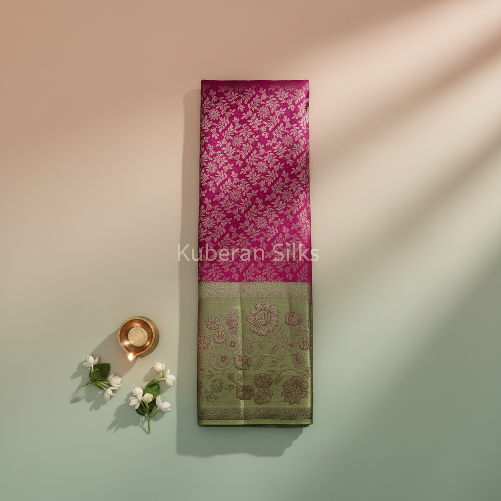 Experience the vibrant elegance of this stunning magenta Kanchipuram silk saree, featuring exquisite pink floral brocade patterns throughout. The rich magenta body is beautifully adorned with elaborate pink and gold floral motifs in a continuous design, complemented by a unique sage green and gold zari border and pallu with traditional floral and geometric patterns.