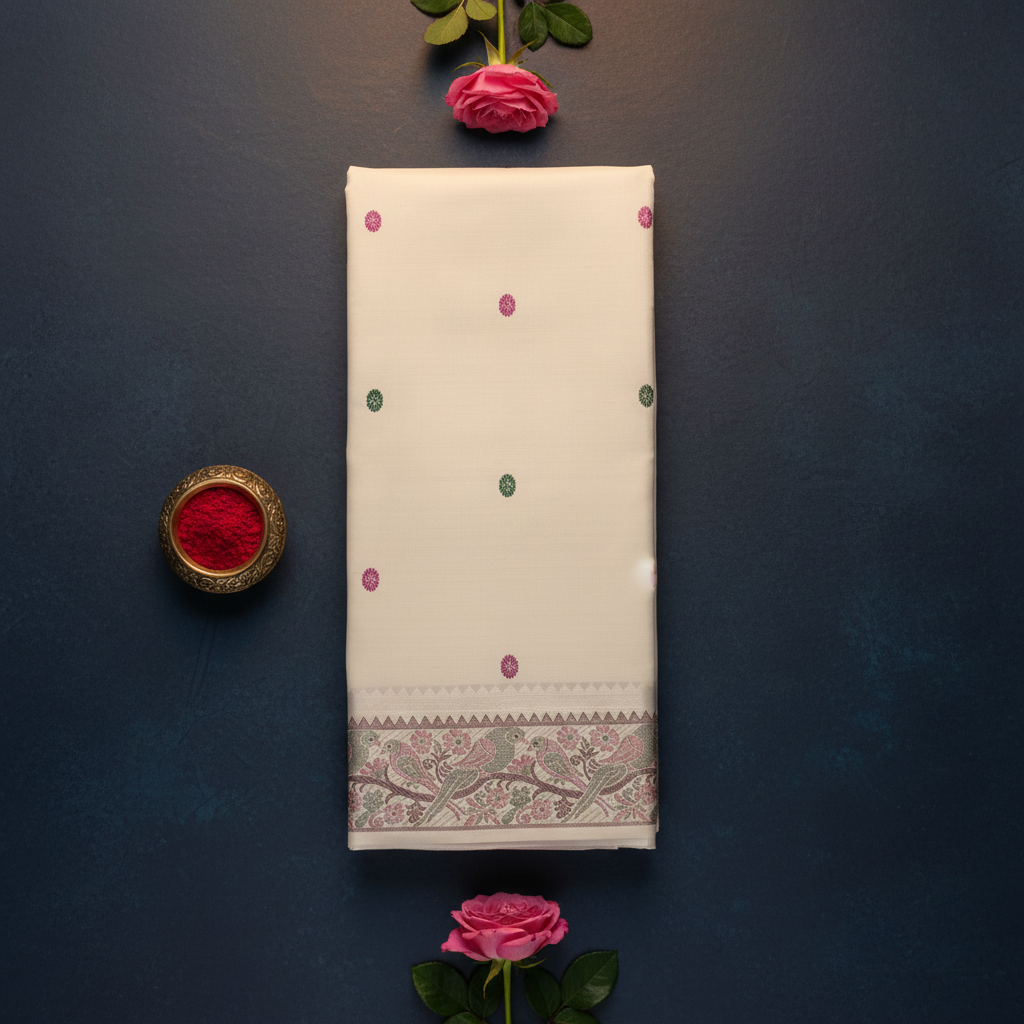 - Body: Pure ivory cream plain silk with scattered alternating meenakari multi-colour circular rosette buttas — deep magenta pink and sage green