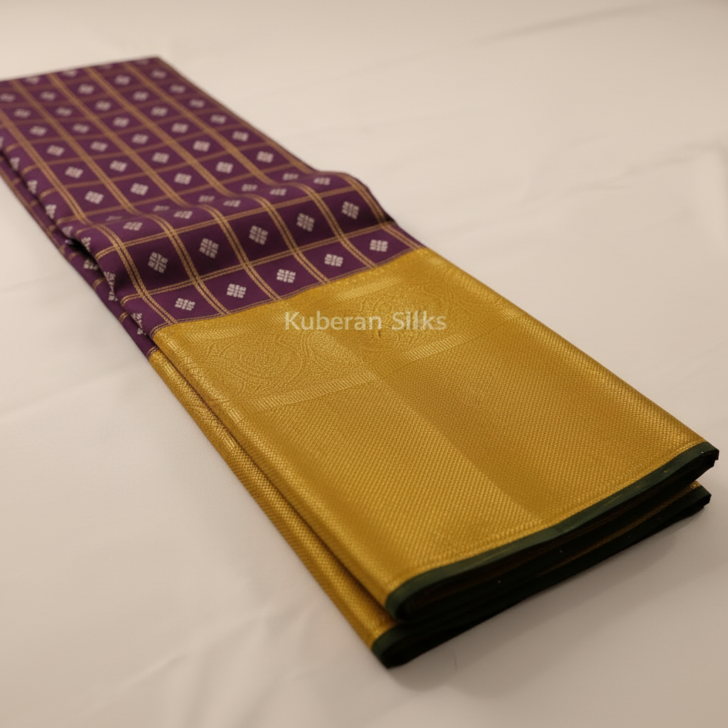 Experience the regal elegance of this stunning purple and yellow Kanchipuram silk saree, featuring exquisite gold zari work with intricate checkered patterns throughout. The rich purple body is beautifully adorned with elaborate gold zari in a distinctive checkered design with floral motifs, complemented by a luxurious golden yellow zari border and pallu with traditional peacock and geometric patterns.