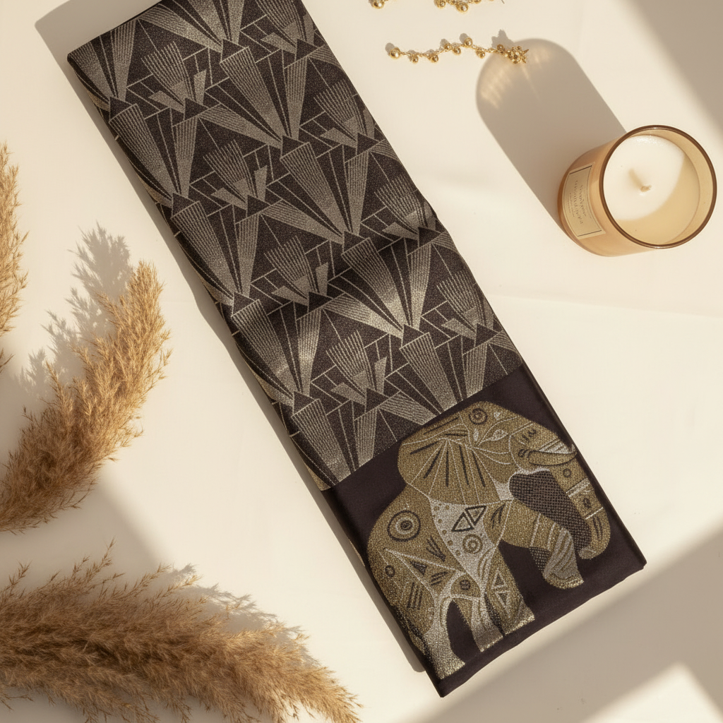 - Pallu: Large-scale gold and silver zari mandala elephant (gaja) motif on plain jet black ground