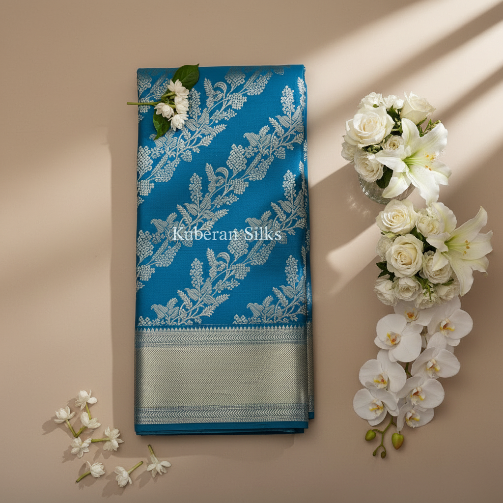 Experience the sophisticated elegance of this stunning teal blue Kanchipuram silk saree, featuring exquisite silver zari work with intricate floral and leaf motifs throughout. The vibrant teal blue body is beautifully adorned with elaborate silver zari patterns in a continuous botanical design with delicate flowers and leaves, complemented by a luxurious silver zari border with traditional geometric patterns.