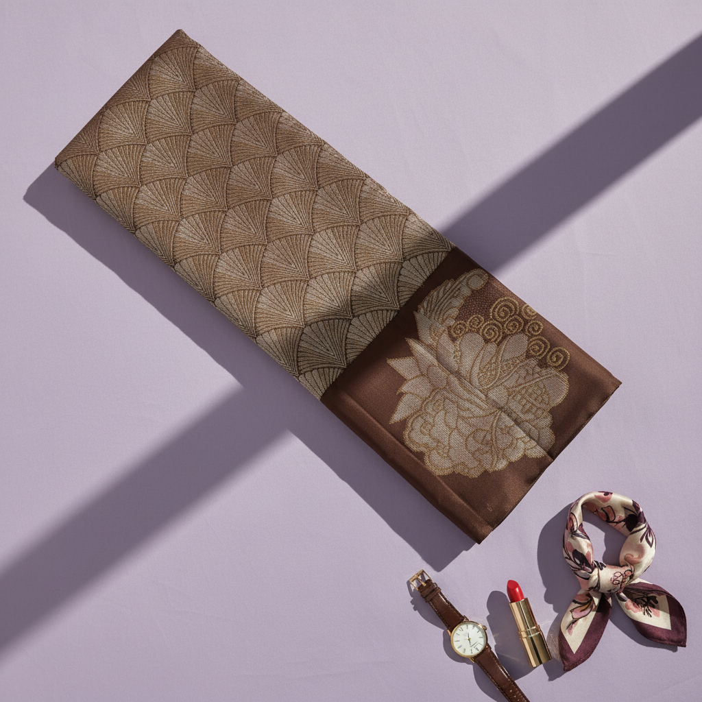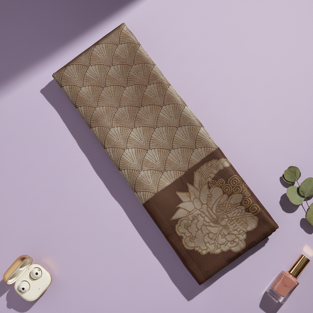 - Body: Warm mocha brown pure silk with all-over gold zari fan (seigaiha) weave