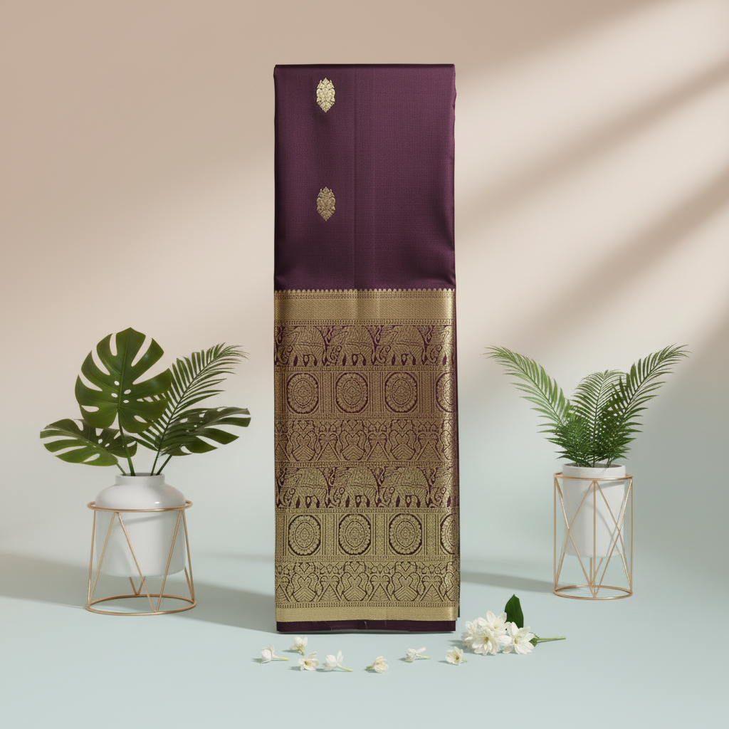 This masterpiece embodies the finest South Indian silk weaving craftsmanship, combining rich royal purple with timeless sophistication.