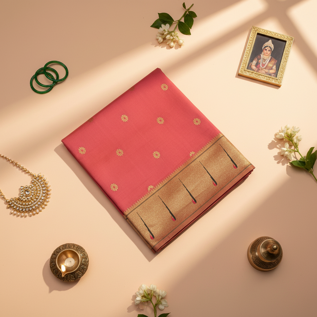 kuberan Coral Pink Paithani Silk Saree with muniya Border