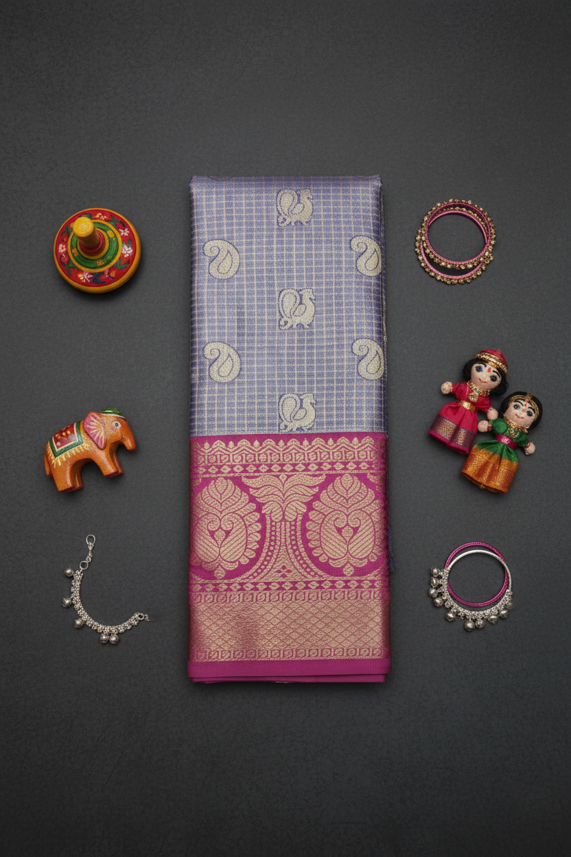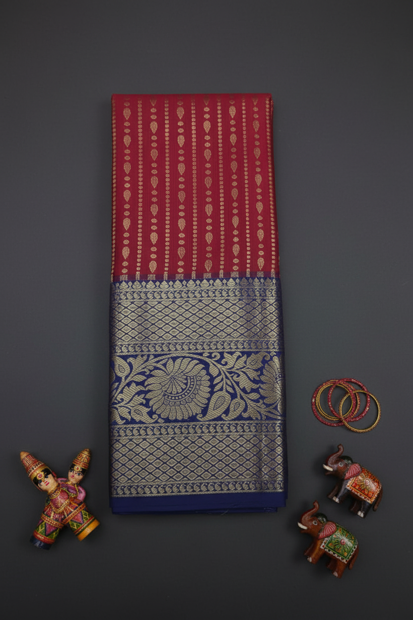 KUBERAN PURE SILK PEACH WITH ROYAL BLUE BORDER PAVADA