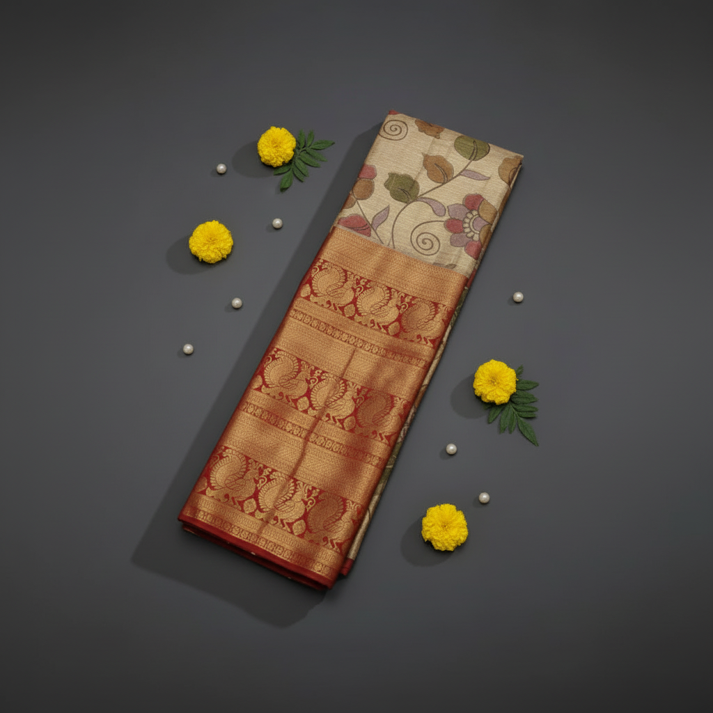 KUBERAN CREAM KALAMKARI WITH RED BORDER PAVADAI