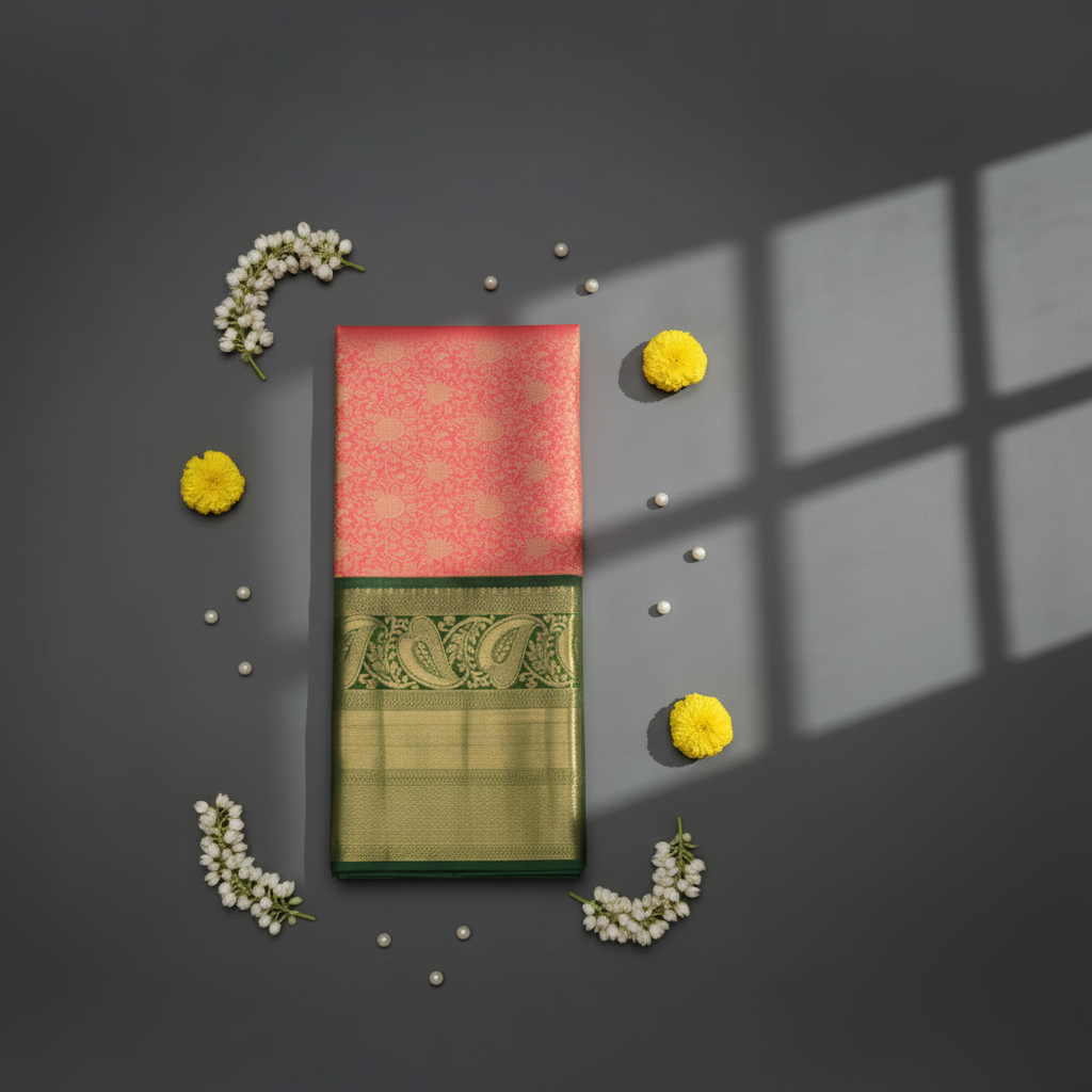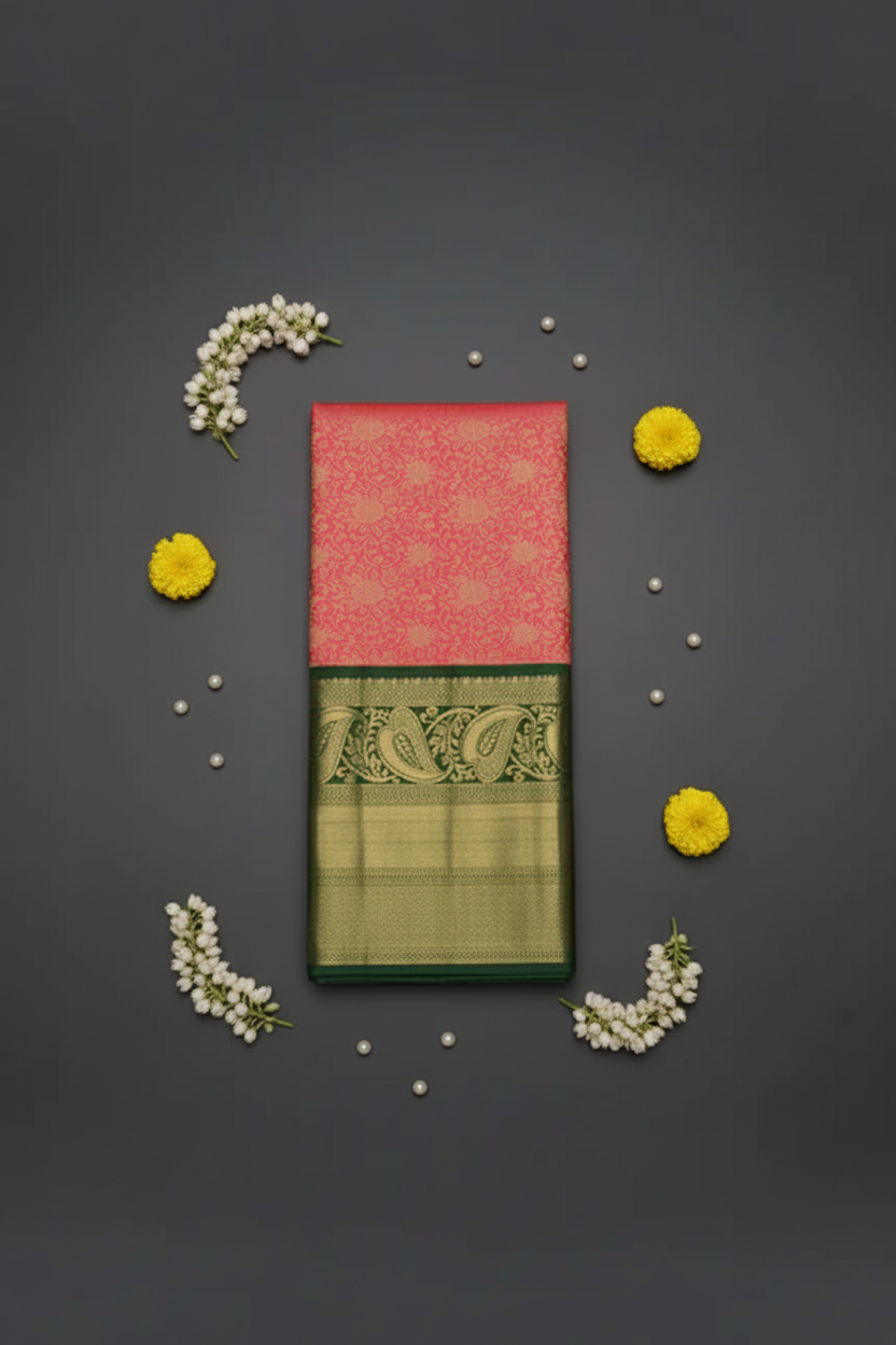 KUBERN PEACH WITH BOTTLE GREEN BORDER PAVADAI
