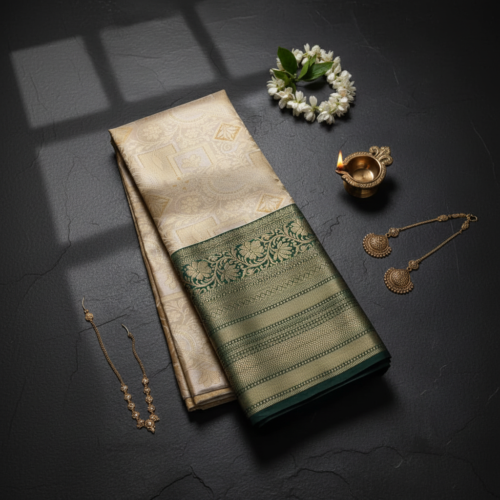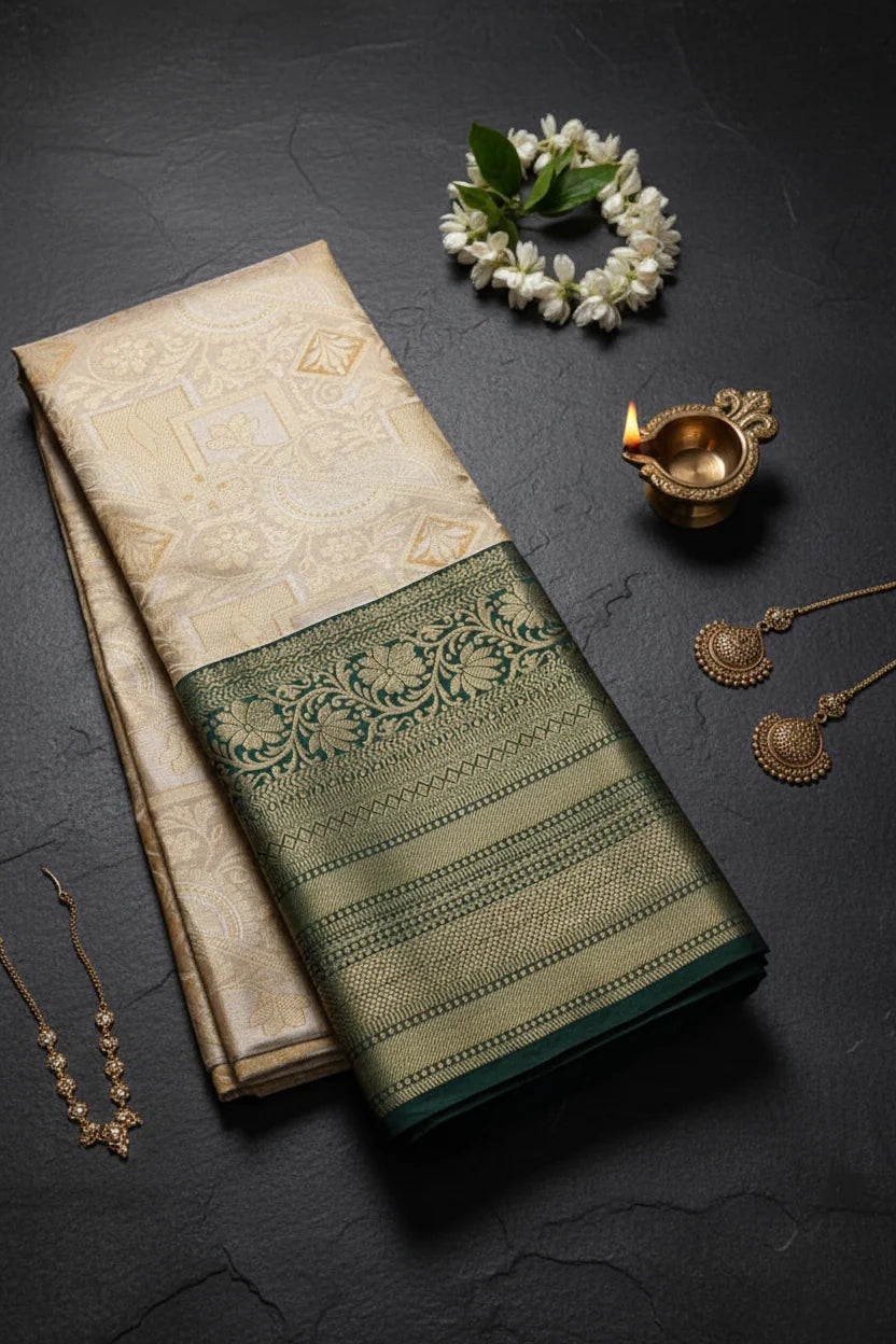 KUBERAN CREAM WITH GREEN BORDER Traditional Pavada