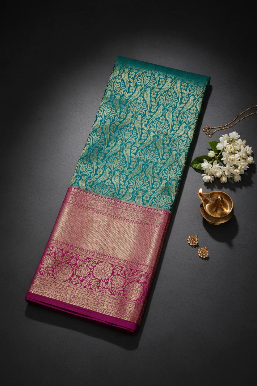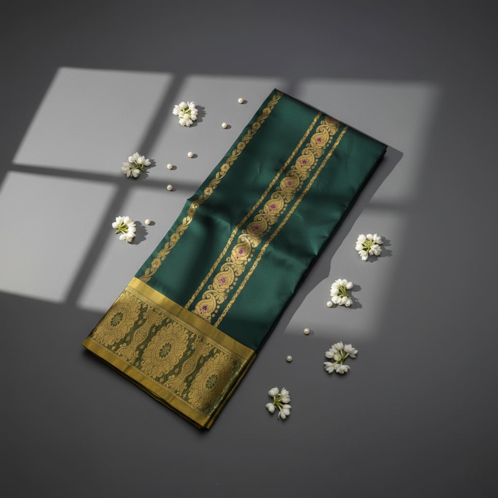 KUBERAN PUR SILK BOTTLE GREEN WITH LIGHT GREEN BORDER PAVADAI