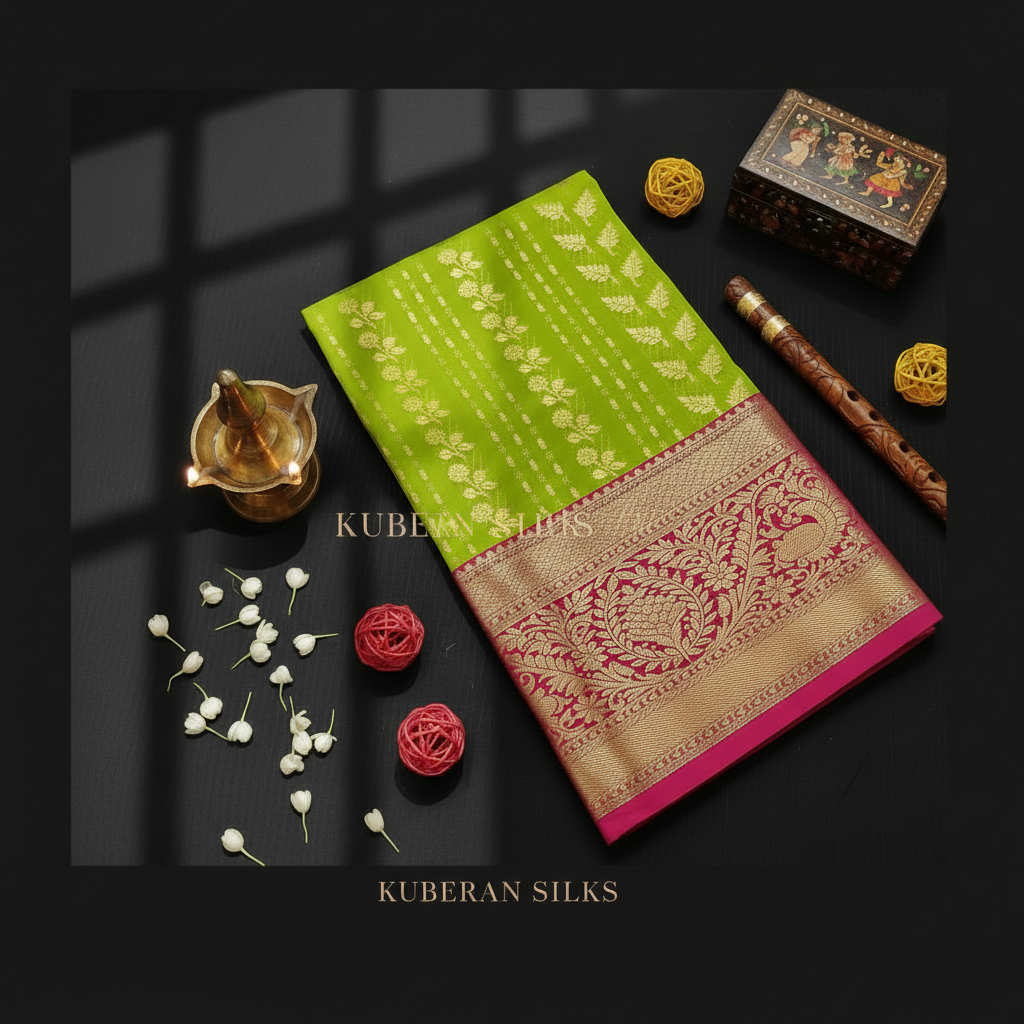 Kuberan Parrot Green Pink Gold Border Pavada