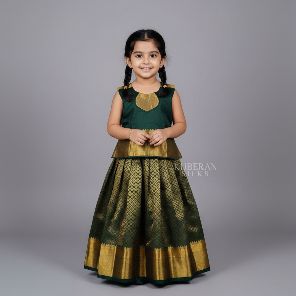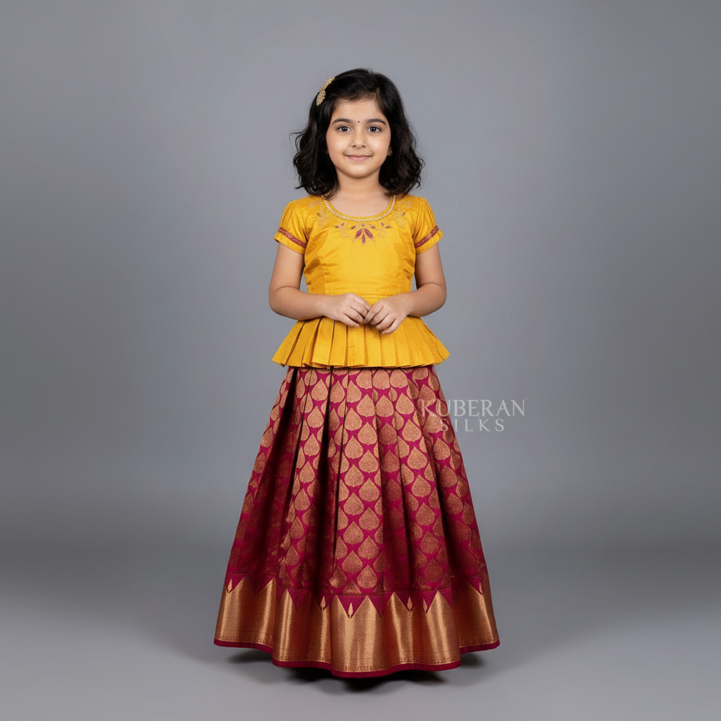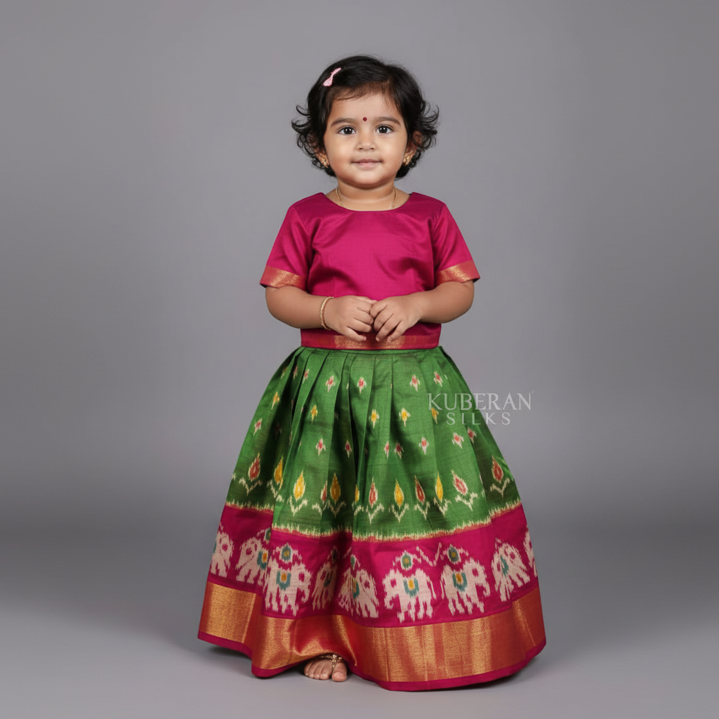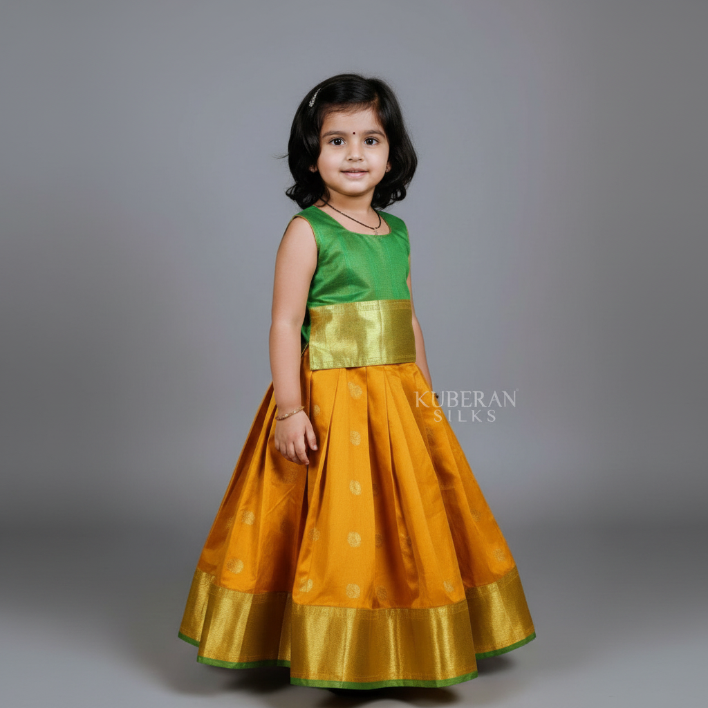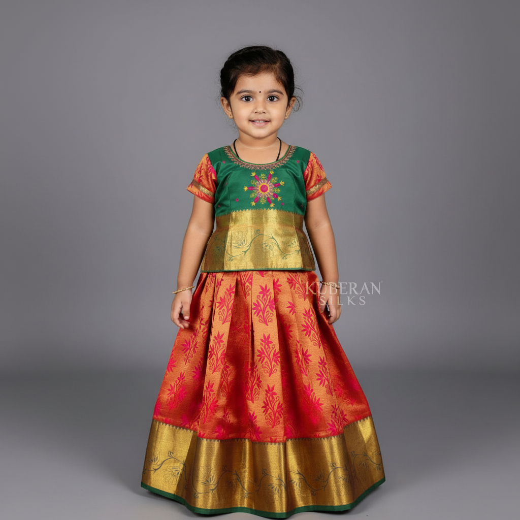 Discover our exquisite range of girls' pavada sets, handcrafted with premium silk and adorned with intricate zari borders. Perfect for festivals, weddings, and special occasions, each piece celebrates traditional South Indian heritage with vibrant colors and authentic loom techniques.