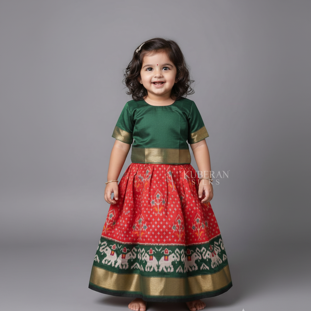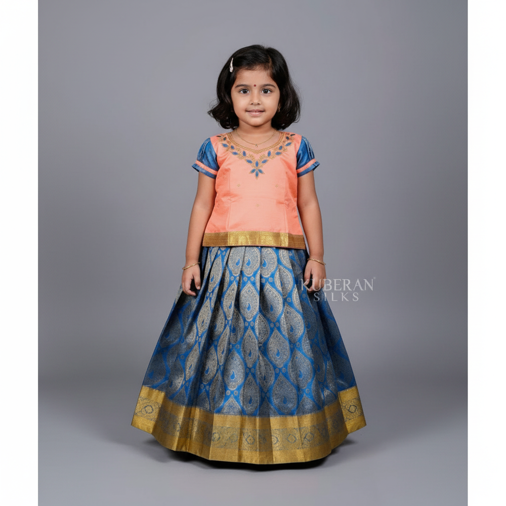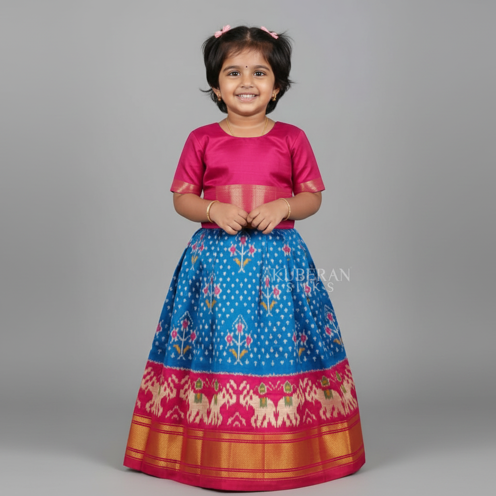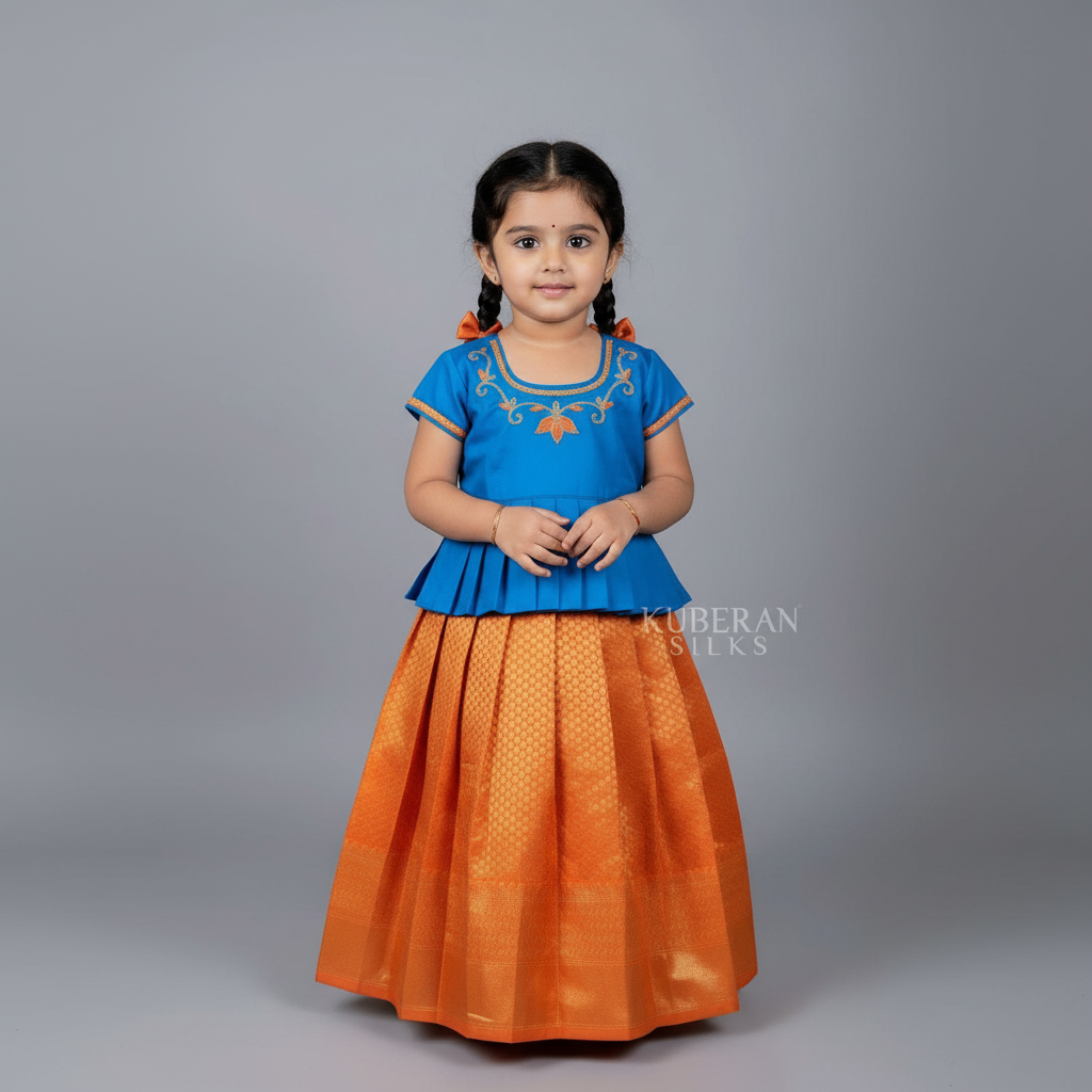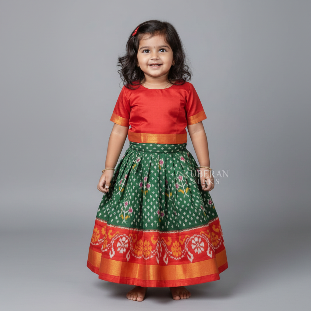Discover our exquisite range of girls' pavada sets, handcrafted with premium silk and adorned with intricate zari borders. Perfect for festivals, weddings, and special occasions, each piece celebrates traditional South Indian heritage with vibrant colors and authentic loom techniques.