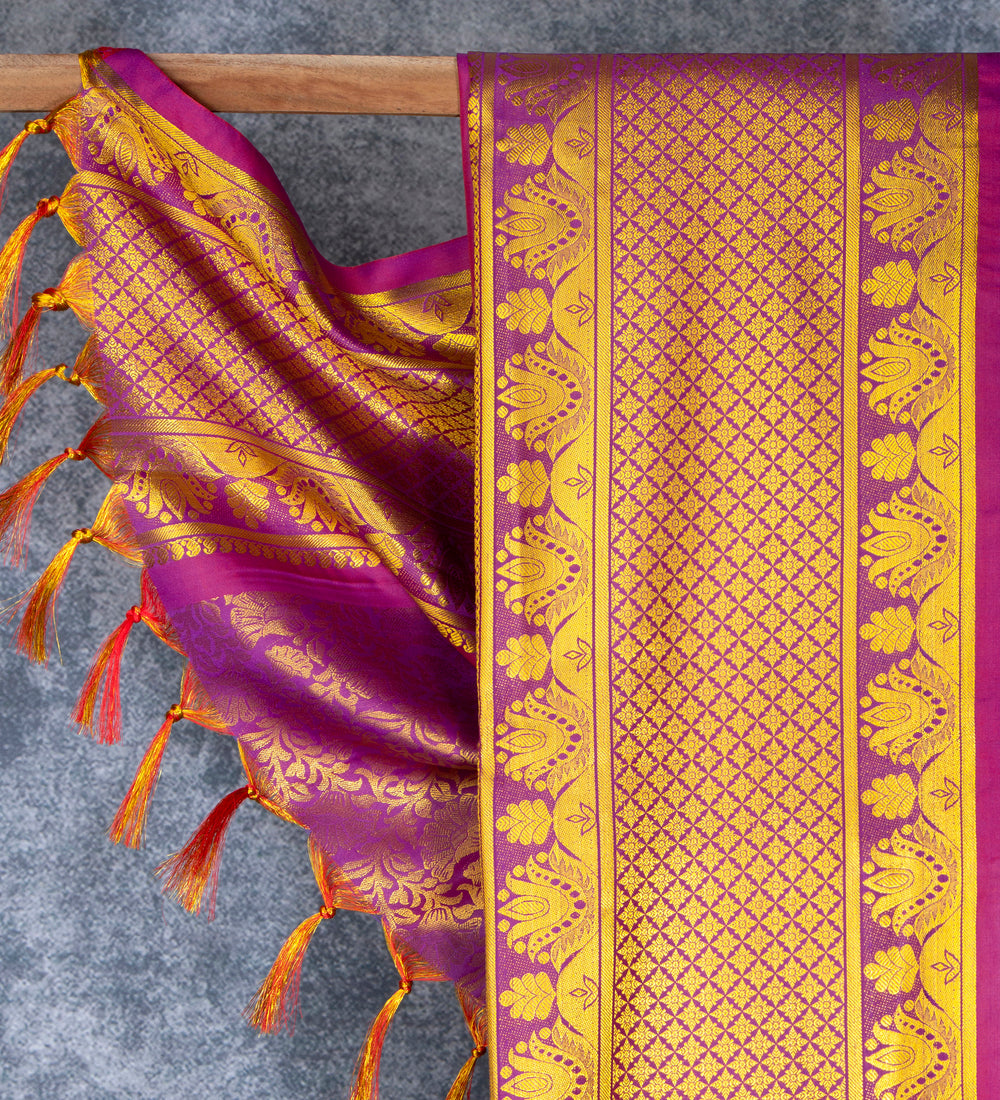 JARI PONNADAI SHAWL of good quality & BIG BORDERS, are used for honouring dignitaries on stage or for felicitation purposes in all types of occasions like in temples for honouring devotees.