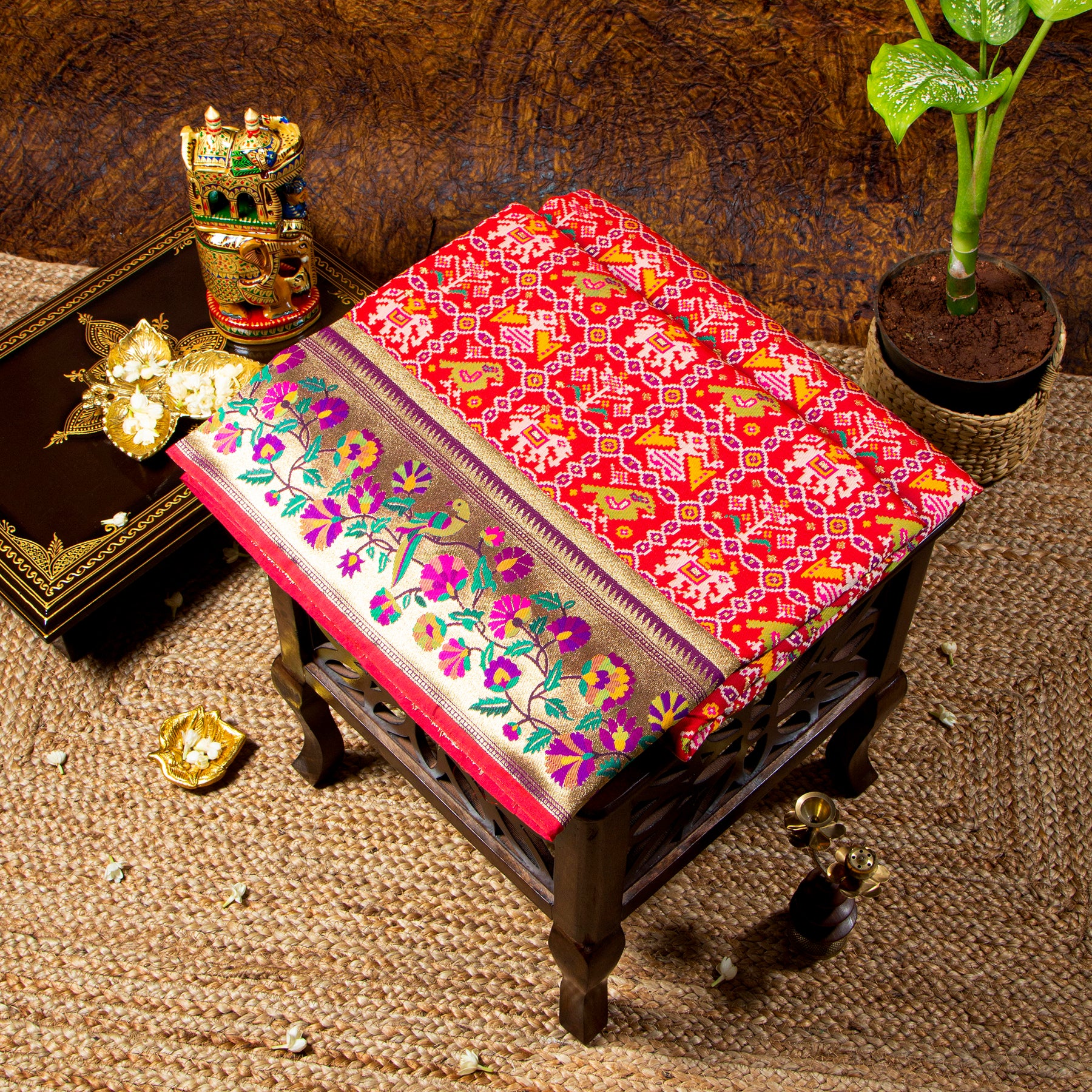 This stunning Kuberan red Paithani Patola saree is sure to turn heads wherever you go. Elegantly crafted in magenta contrast, its intricate design and rich hue will make you the star of the show. Feel confident and beautiful in this classic ensemble.