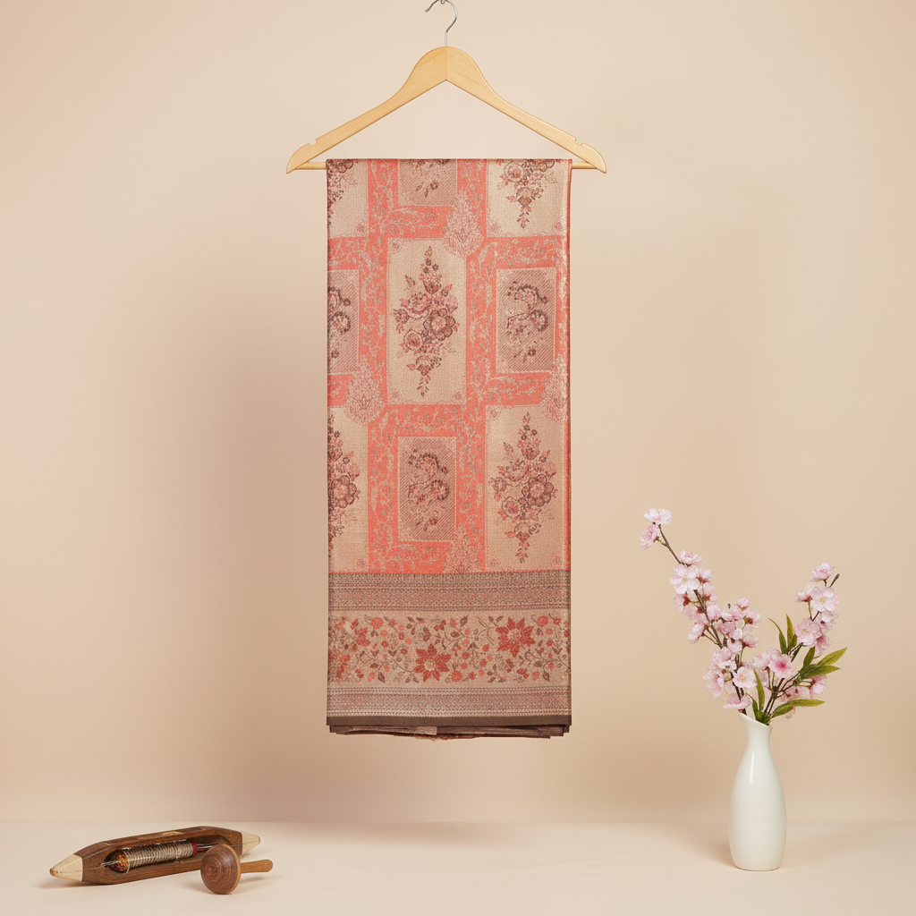 Embrace timeless elegance with this exquisite Pure Kanchipuram Silk Saree in soft coral-pink and beige tones. Handwoven by master artisans, this luxurious saree showcases the finest traditions of South Indian silk weaving.