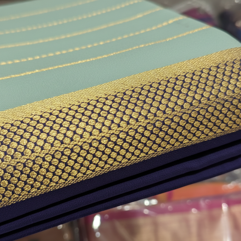 The contrast between the soft mint and deep navy creates a regal yet modern aesthetic, making this saree perfect for festive occasions, celebrations, and special gatherings. The premium silk fabric drapes gracefully while the meticulous zari work reflects superior weaving artistry.
