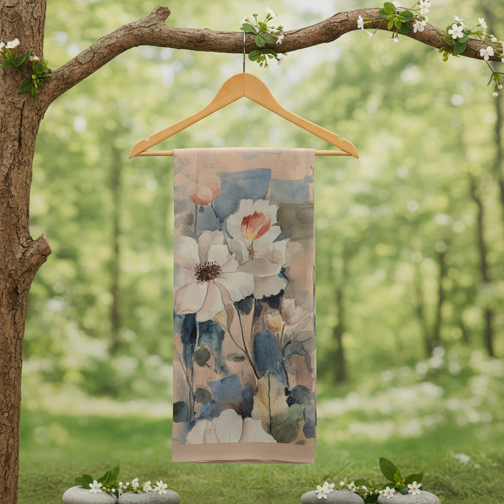 Discover artistic elegance with this beautiful beige pure chiffon saree featuring a stunning watercolor floral print. Adorned with delicate white flowers and blue-grey leaves in a dreamy watercolor style, this saree beautifully combines contemporary artistry with graceful sophistication.