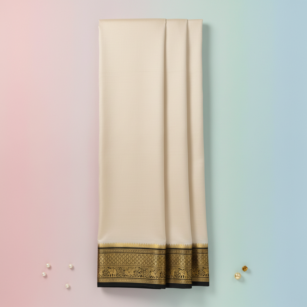 Embrace timeless elegance with this exquisite cream mysore silk saree featuring a stunning golden zari border. The pristine off-white body showcases the natural luster of premium silk, while the intricately woven golden border displays traditional motifs that celebrate heritage craftsmanship.