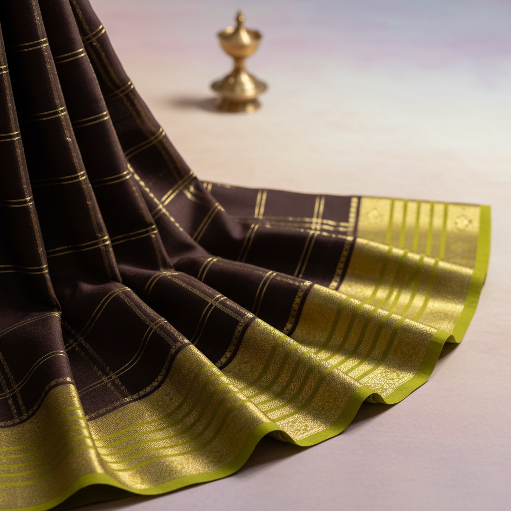 Experience timeless sophistication with this exquisite brown mysore silk saree that beautifully combines traditional elegance with contemporary style. The rich brown body features a delicate golden zari checks pattern throughout, creating a subtle yet luxurious texture that catches the light beautifully.