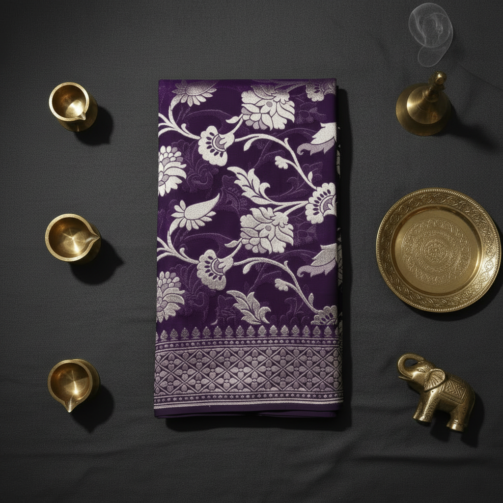 Embrace regal elegance with this stunning deep purple pure Banarasi georgette silk saree, adorned with exquisite silver floral motifs. A masterpiece of traditional Varanasi craftsmanship, this saree beautifully combines rich color with delicate artistry for a truly luxurious drape.