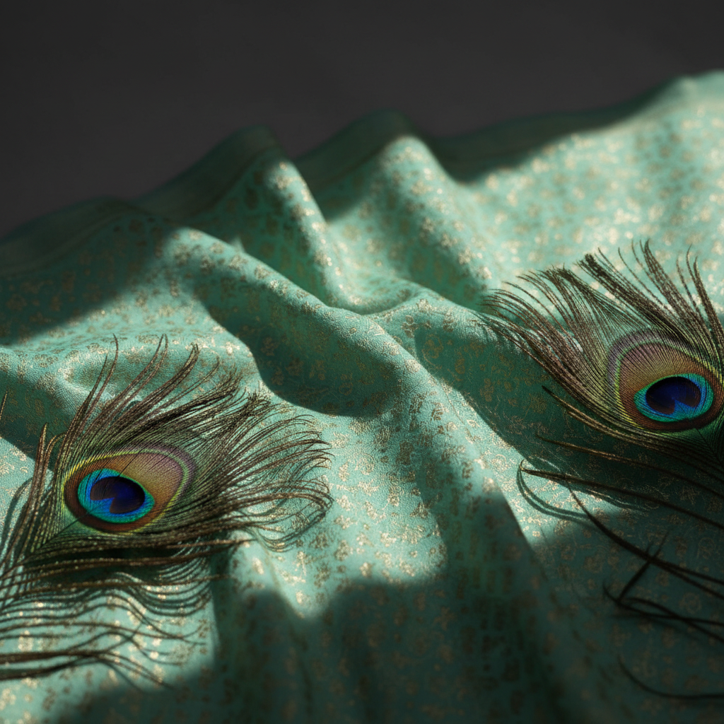 - Peacock feather motifs throughout