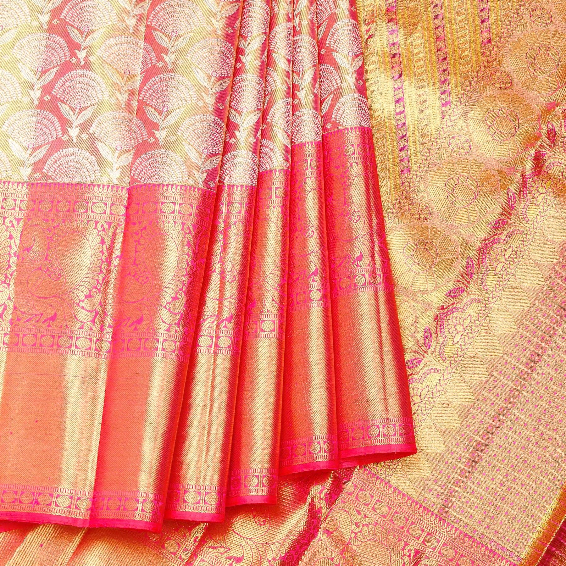 Hey, Grab!!! the latest collection from the house of kuberan silks. This saree is pure Kanchipuram silk handloom saree with contrast border, which is inter-created zari weaving with beautiful designer motifs and rich pallu. This saree is complimented with unstitched blouse. This saree is SILK Mark authenticated.