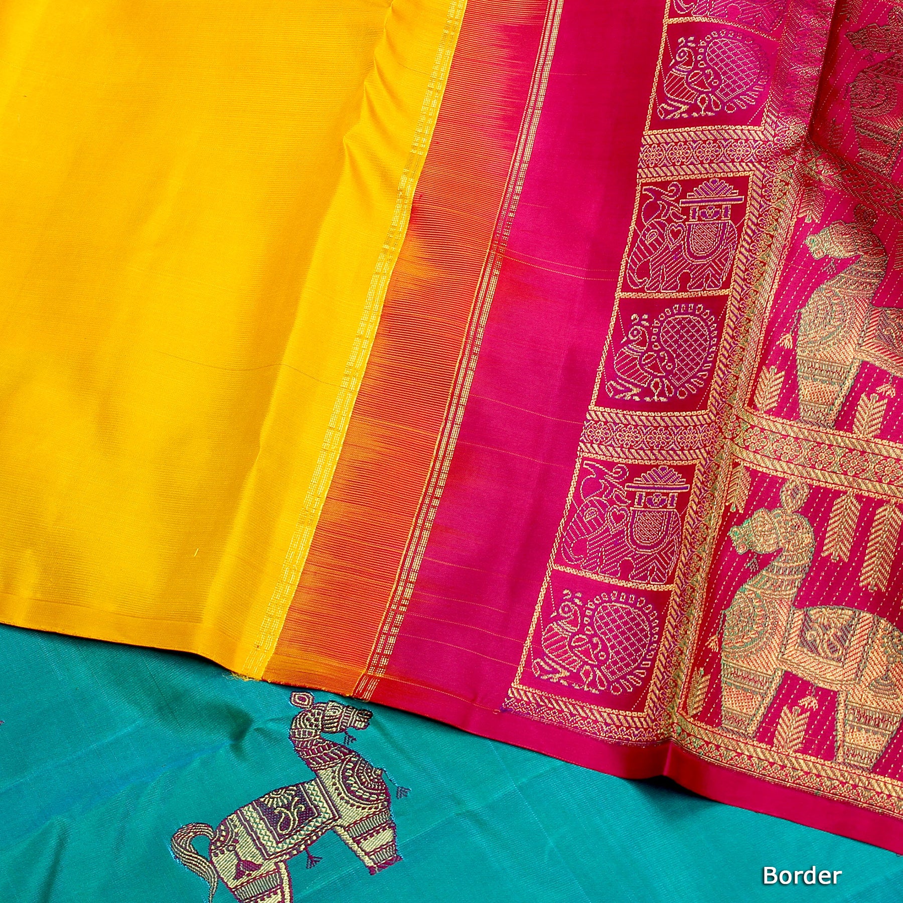 hey beautiful grab the latest collection of kuberan silks.This designer piece kanchivaram silk saree.This pink blue yellow with all over designer motif that has blue rich pallu.This saree comes with a beautiful blue blouse.This saree comes with a SILK MARK authenticated.