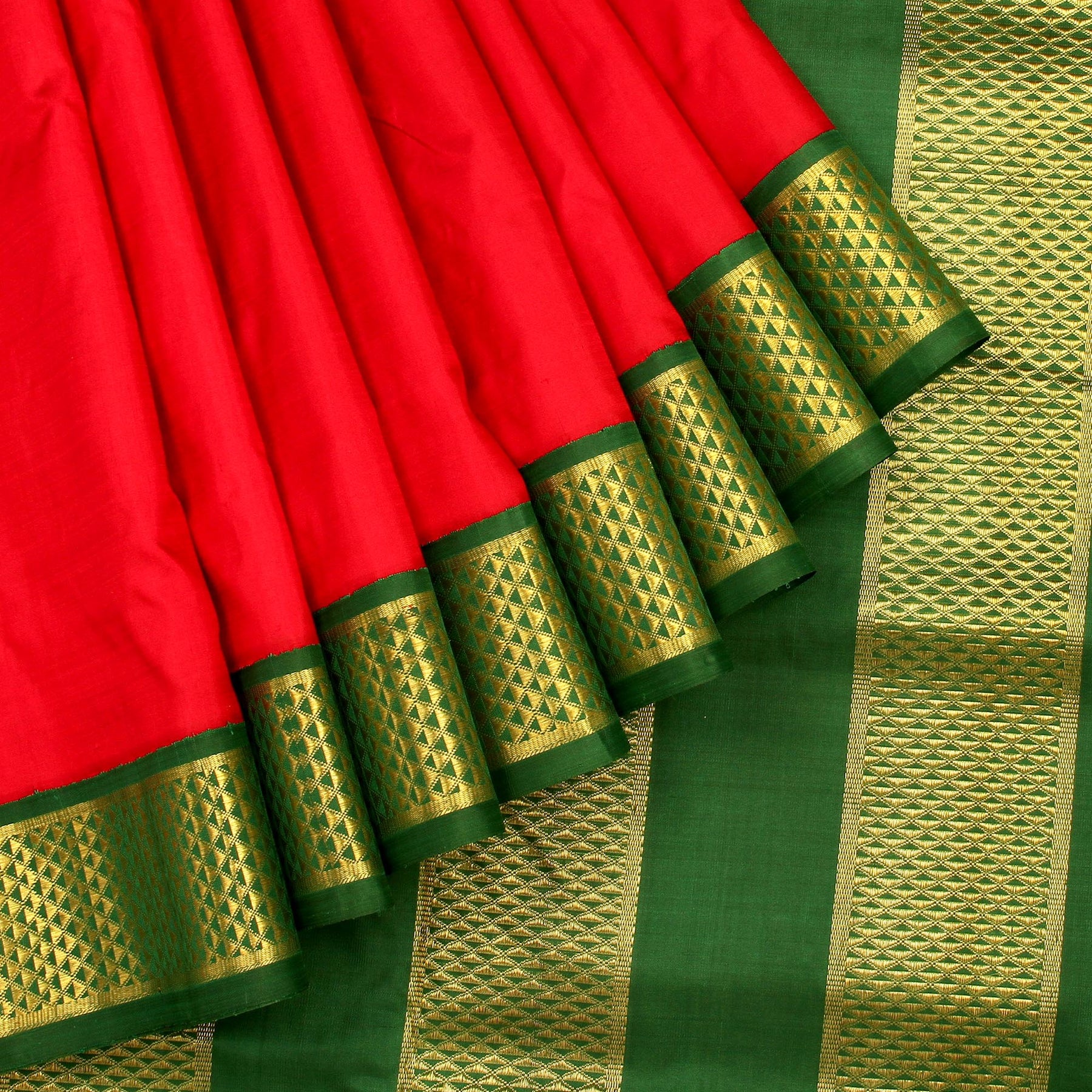 Comfortable 9 yards pure silk saree with extensive range from the house of kuberan silks. This 9 yards saree is traditional zari handloom saree which has contrast border and pallu. This saree is indulged with the finest border which is a symbol of beautiful art work done. This saree is 8.10 metres (9 gaja) and doesn't have blouse piece . This saree is SILK MARK authenticated.