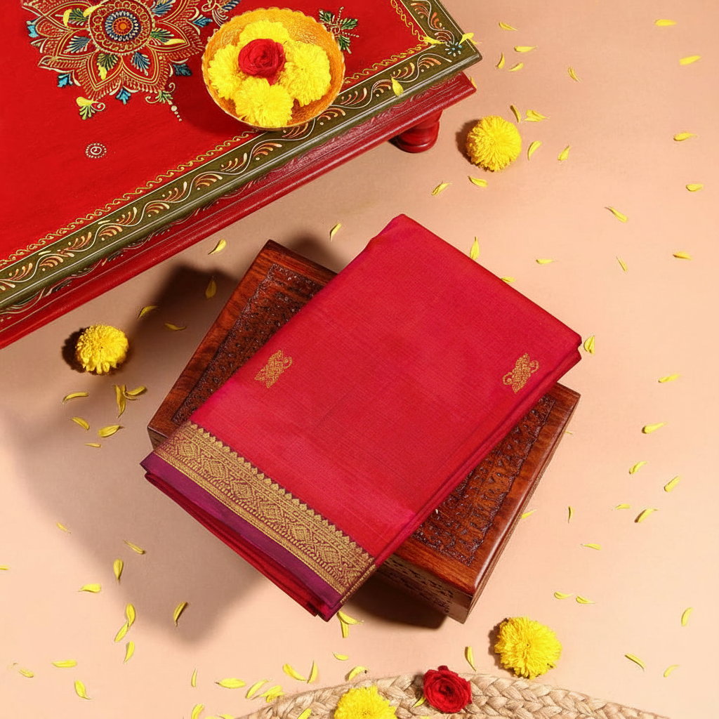 Embrace timeless elegance with this stunning red Kanchipuram silk saree featuring intricate gold zari work. Handwoven with premium silk, this saree showcases traditional temple motifs and a rich purple contrast border that exemplifies the heritage craftsmanship of Kanchipuram.