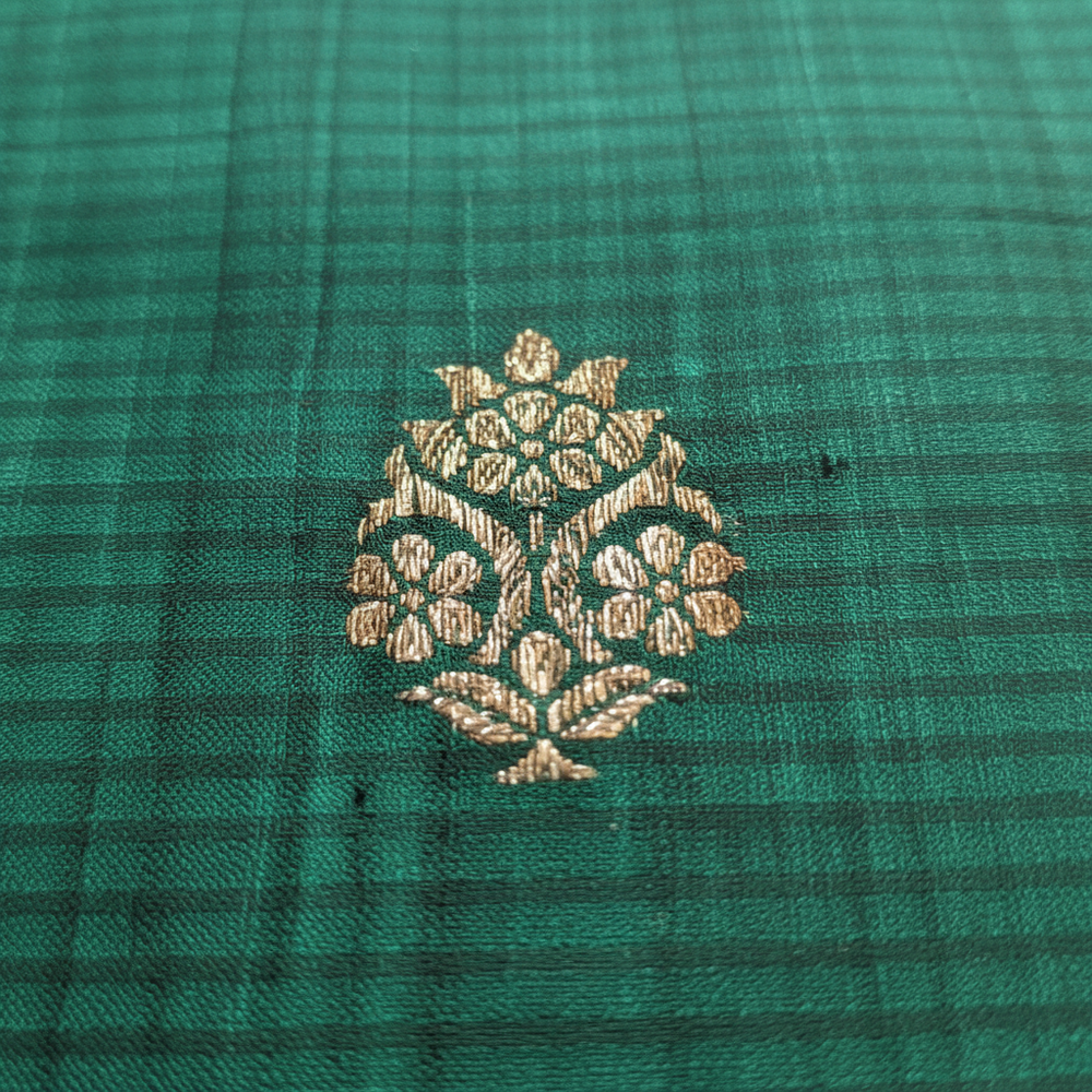 Embrace regal elegance with this stunning emerald green Banarasi silk saree, a masterpiece of traditional Indian craftsmanship. Handwoven by skilled artisans, this luxurious saree features delicate floral medallions and an ornate rose-gold border that showcases the timeless artistry of Banarasi weaving.