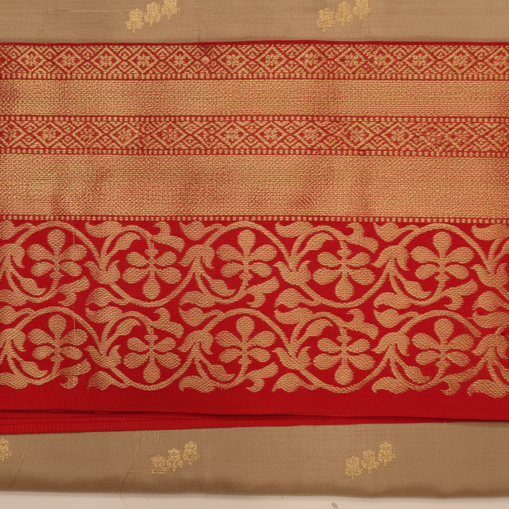 Discover timeless sophistication with this exquisite beige silk saree, a masterpiece that beautifully balances subtle elegance with striking detail. The soft beige body is adorned with delicate golden embroidered motifs scattered throughout, creating a refined and luxurious canvas.