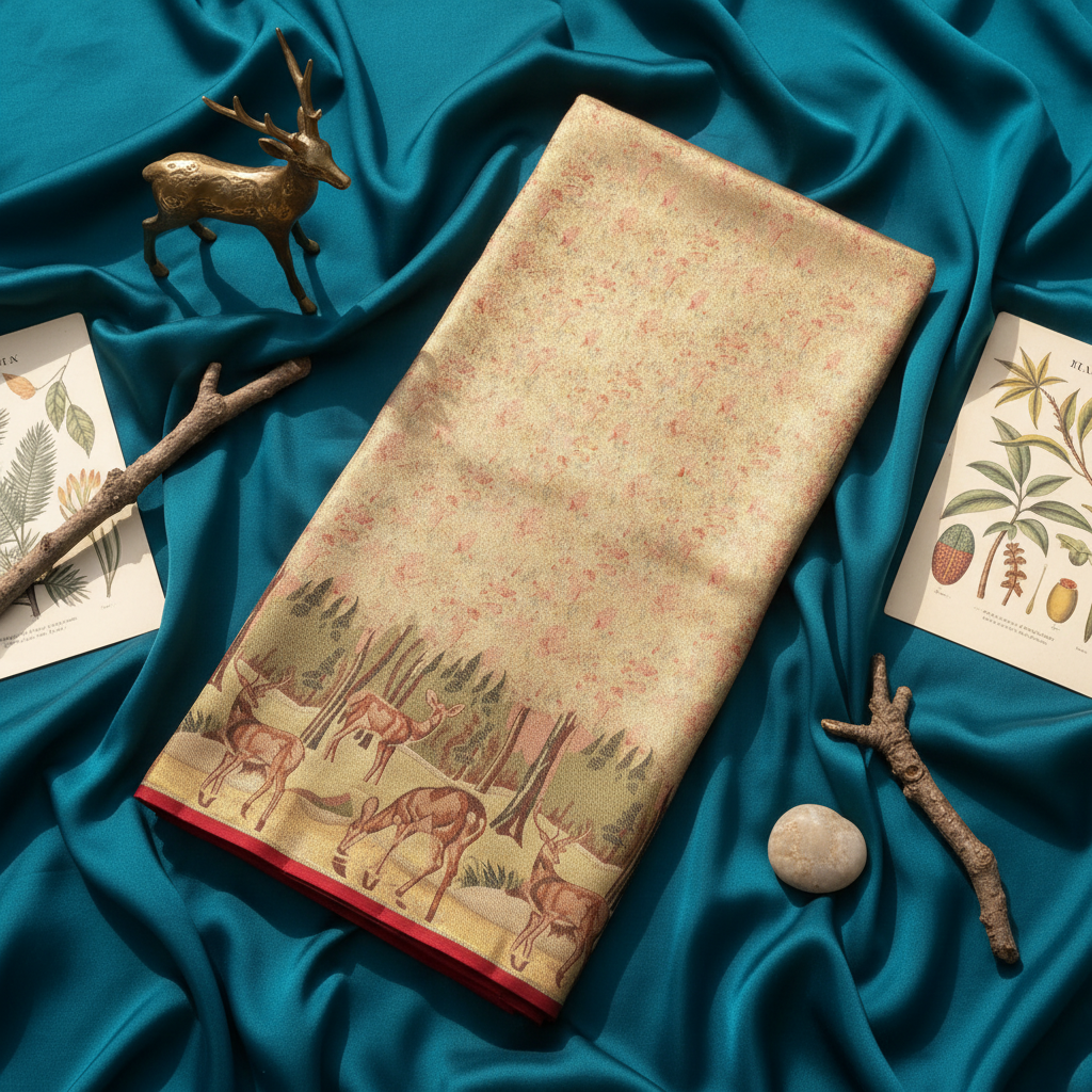 Exquisite Kanchipuram silk saree in soft cream/beige featuring a subtle all-over texture. The stunning border showcases an enchanting jungle scene with deer, animals, and trees in a natural forest setting, beautifully woven in brown, pink, and green zari. The elegant pink-red border adds a vibrant finishing touch.