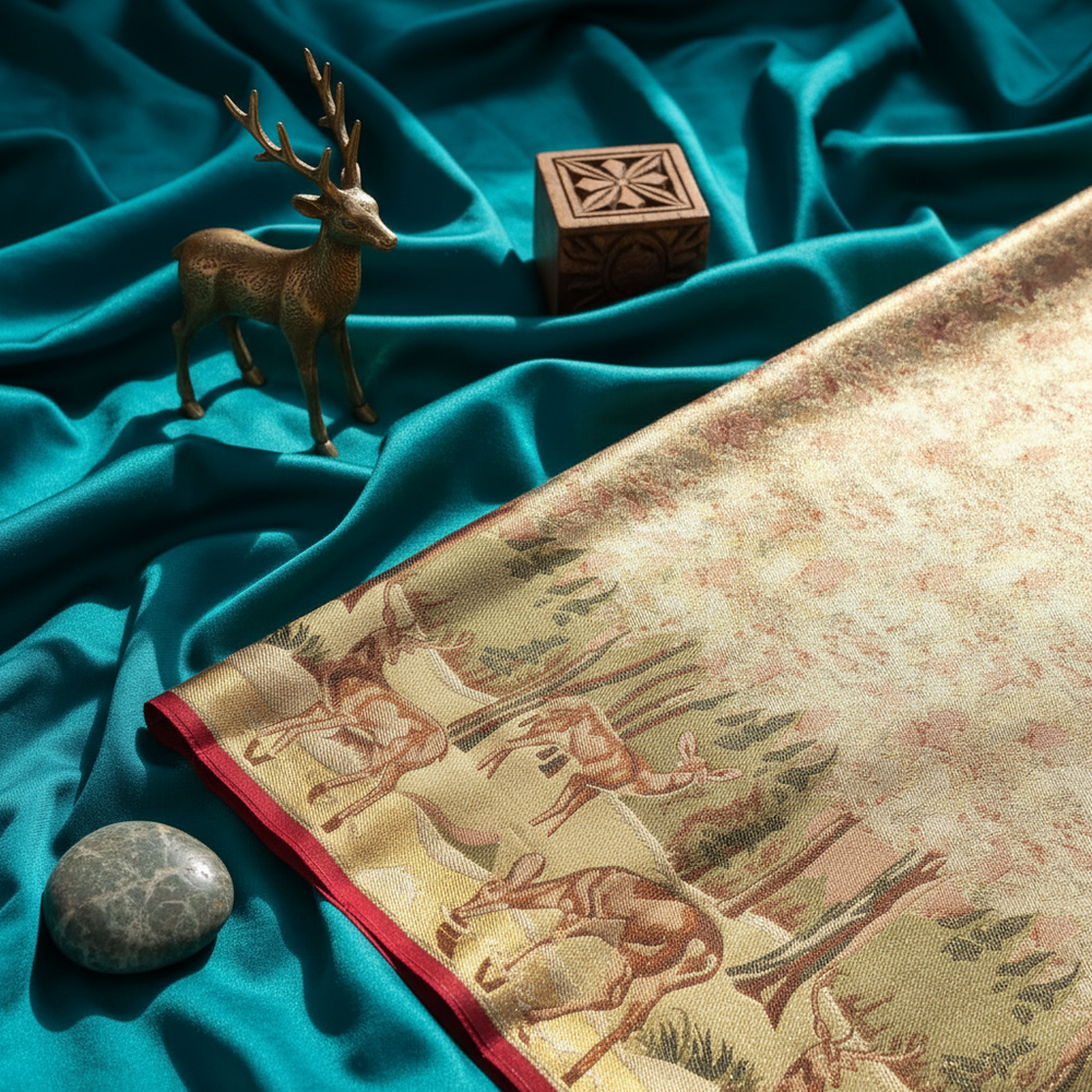 • Intricate brown, pink, and green zari work depicting forest wildlife
