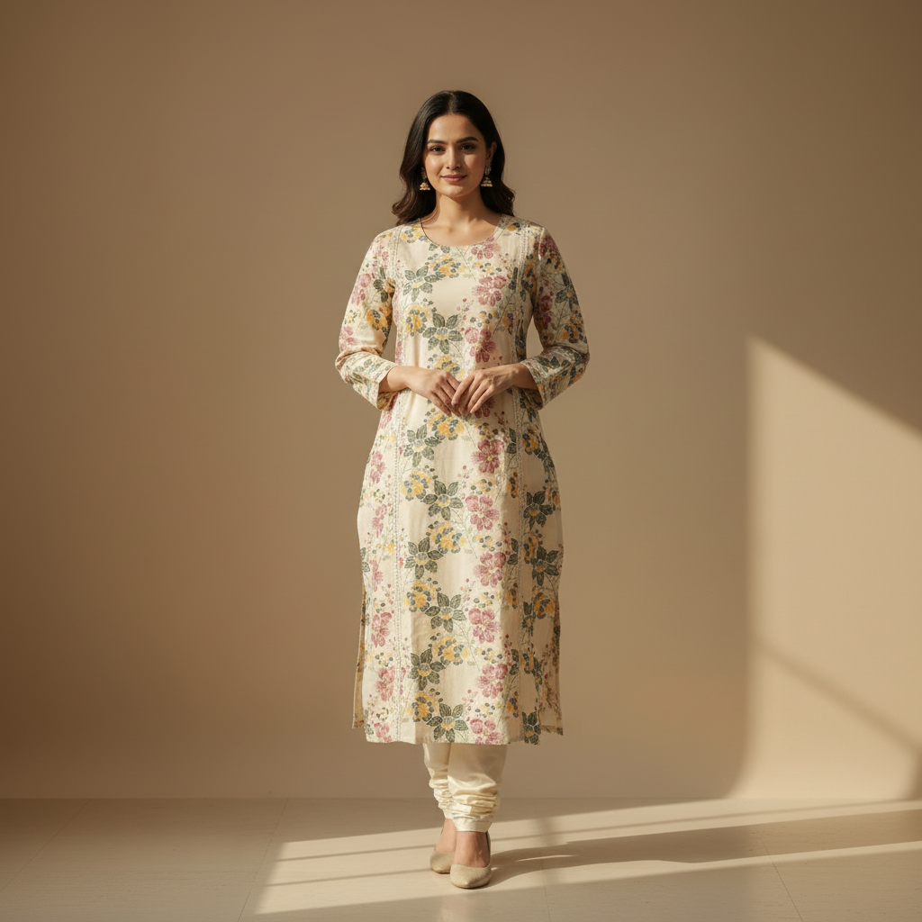 Embrace timeless elegance with this exquisite cream-colored kurti adorned with beautiful multicolored floral embroidery. The delicate floral motifs in shades of pink, yellow, and green create a charming garden-inspired pattern across the fabric. This knee-length straight-cut kurti features full sleeves with matching floral embroidery, a round neckline, and side slits for ease of movement. The set comes complete with matching cream Perfect for festive celebrations, family gatherings, office wear, or casual outings.