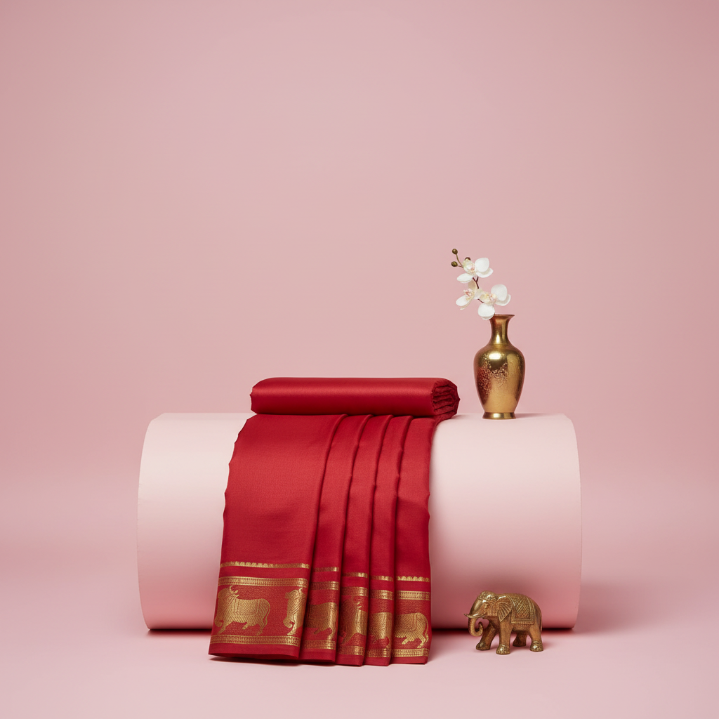 Embrace timeless elegance with this stunning red mysore silk saree featuring an exquisite golden zari border adorned with traditional nandi motifs. The rich crimson hue of the pure silk fabric creates a regal canvas, while the intricately woven golden border showcases masterful craftsmanship and heritage weaving techniques.
