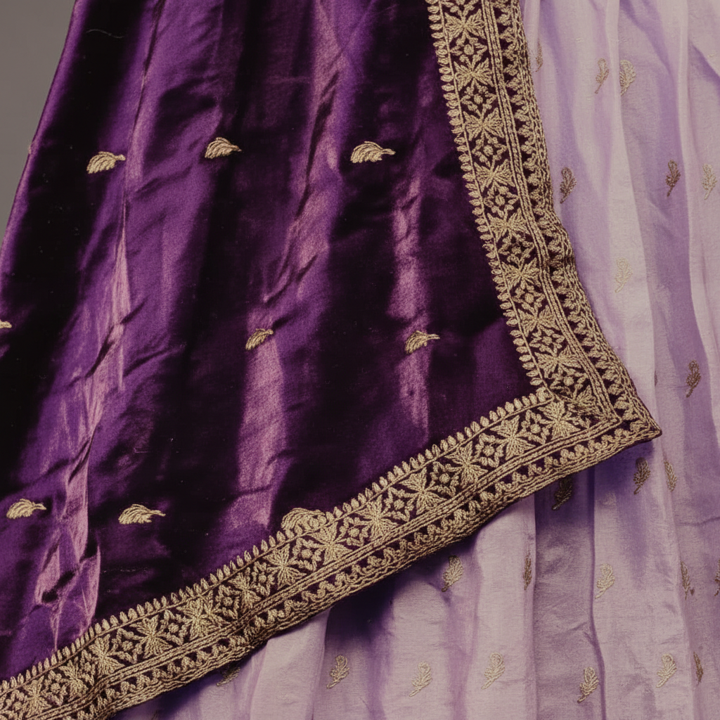 • Dupatta: Rich purple velvet dupatta with golden embroidered trim for a luxurious finish